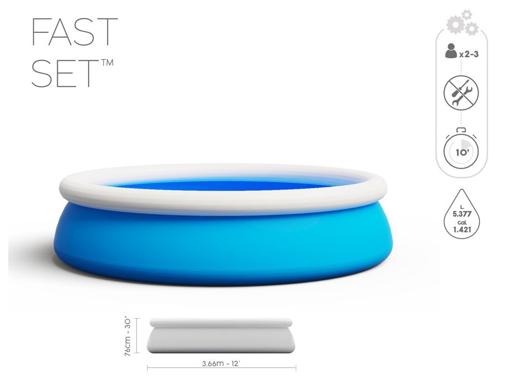 Piscinele Fast Set se caracterizează mai ales prin ușurința lor extraordinară de asamblare - trebuie doar să așezați cada de piscină pe o suprafață dură, plană, să umflați inelul perimetral și să umpleți cu apă. Construcția Fast Set permite reglarea înălțimii piscinei - la umplerea cu apă, pereții piscinei sunt întinși de apă și se ridică odată cu nivelul apei. Datorită acestui fapt, piscina poate fi folosită la diferite adâncimi de apă, iar copiii care se joacă pot fi observați fără a fi acoperiți de pereții piscinei. Este posibil să începeți utilizarea piscinei atunci când nivelul apei este de la câțiva până la câteva zeci de cm.