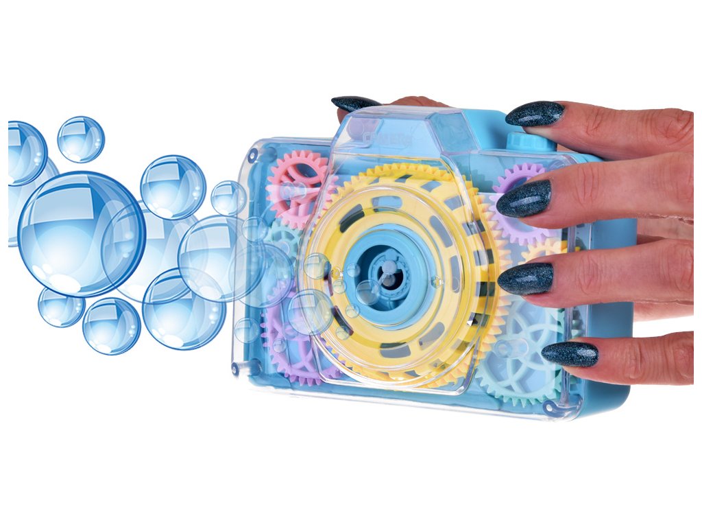 La fiecare apăsare a butonului declanșator, camera emite sunete realiste de declanșare și emite lumini intermitente, simulând procesul de fotografiere , făcând distracția și mai realistă și mai interesantă. Dar asta nu este tot! Camera are, de asemenea, un mecanism încorporat pentru a face bule care plutesc în aer și creează un efect magic care va încânta pe toată lumea , plus că dimțaturile de lucru pot fi văzute sub capacul transparent, ceea ce adaugă și mai multă atractivitate întregii jucării.