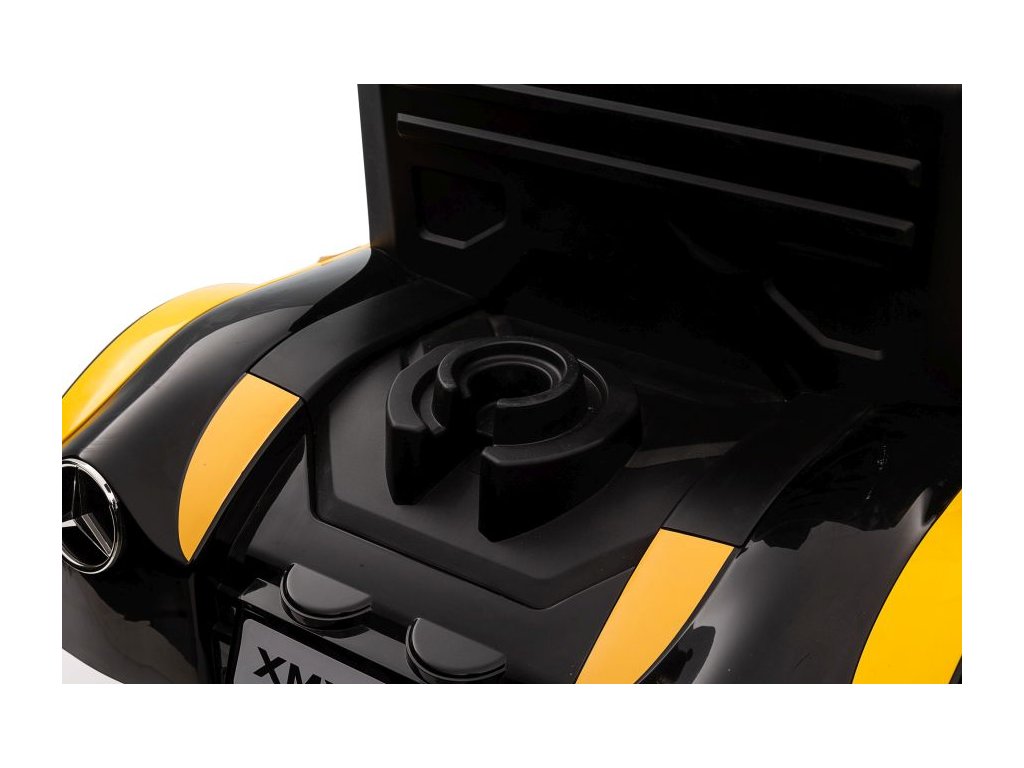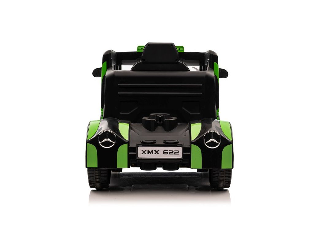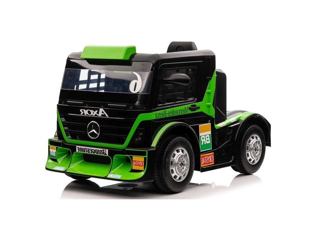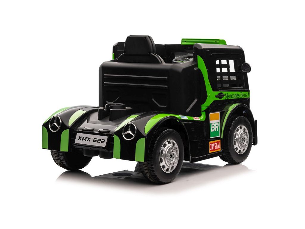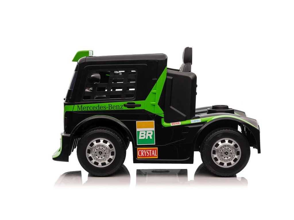 Camion electric Mercedes-Benz Actros pentru copii cu afișaj LCD tactil și scaun confortabil din piele ecologică cu centuri de siguranță. Copilul poate controla mașina de jucărie complet independent, dar părinții pot interfera oricând cu călătoria folosind telecomanda. Șoferul este echipat cu butoane pentru schimbarea direcției de mers în toate direcțiile și un buton de siguranță STOP , care oprește imediat vehiculul și îi dezactivează toate funcțiile.