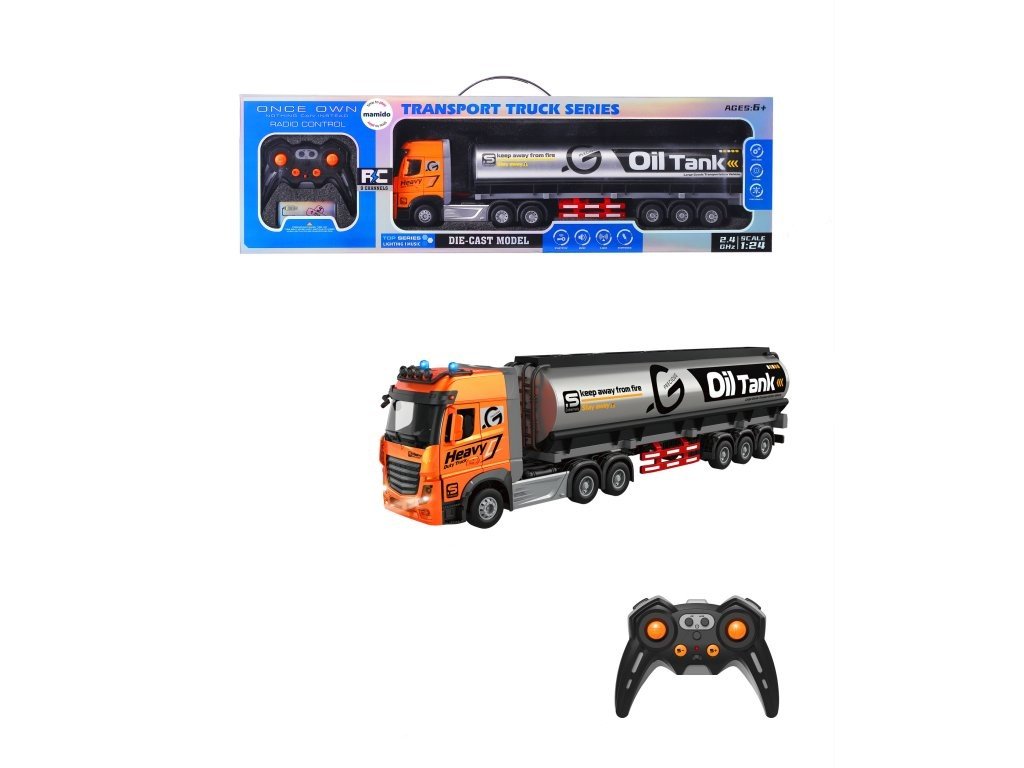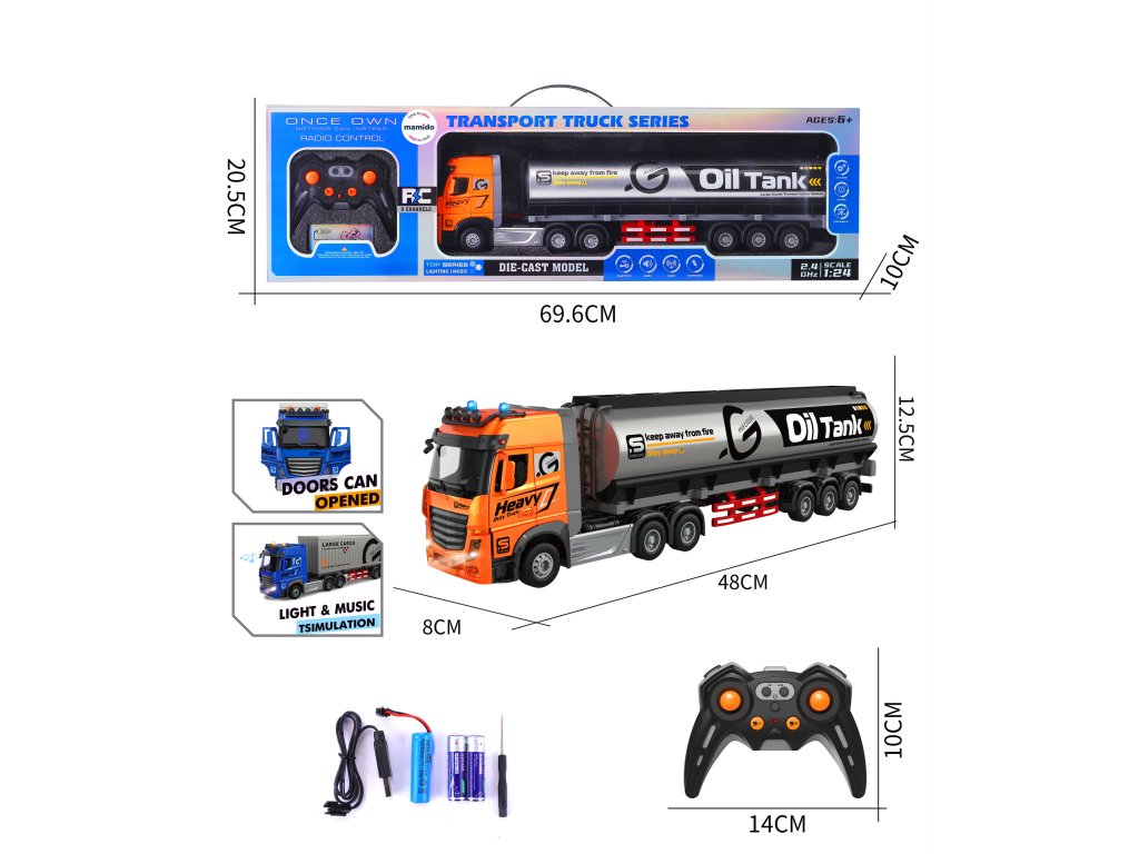 Un camion RC cu cisternă, detaliat, la scara 1:24, va încânta toți micii fani ai camioanelor. Modelul cu o lungime de 48 cm este fabricat cu accent pe detalii realiste, cum ar fi uși care se deschid, efecte luminoase și sunetul motorului.