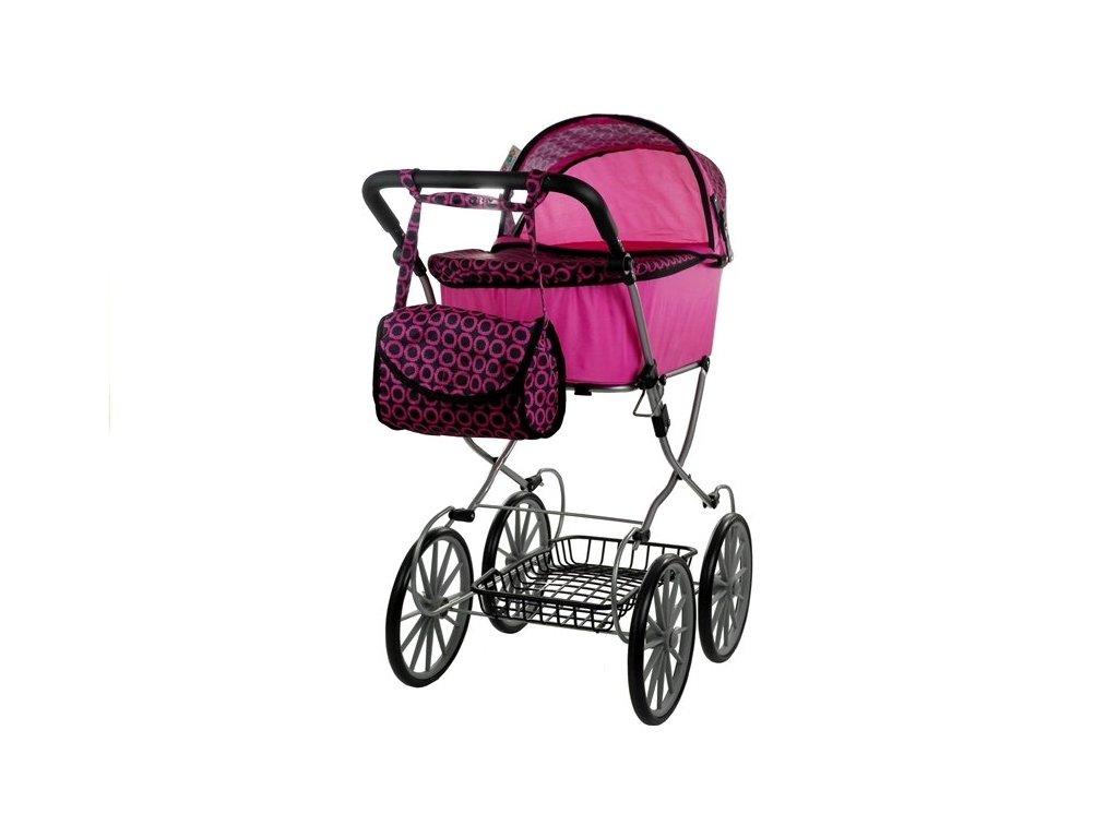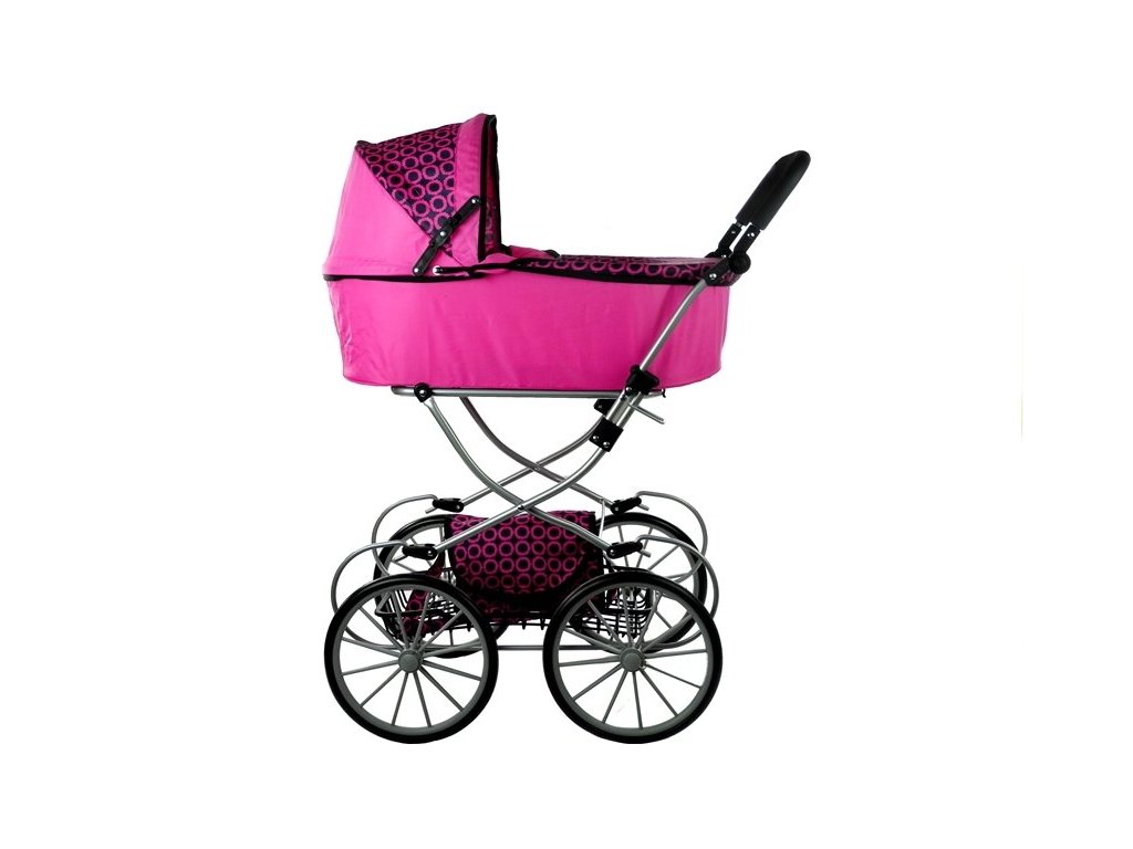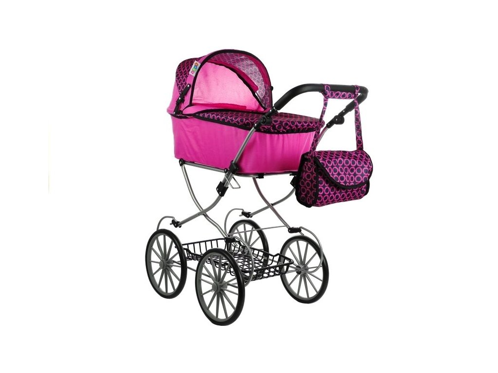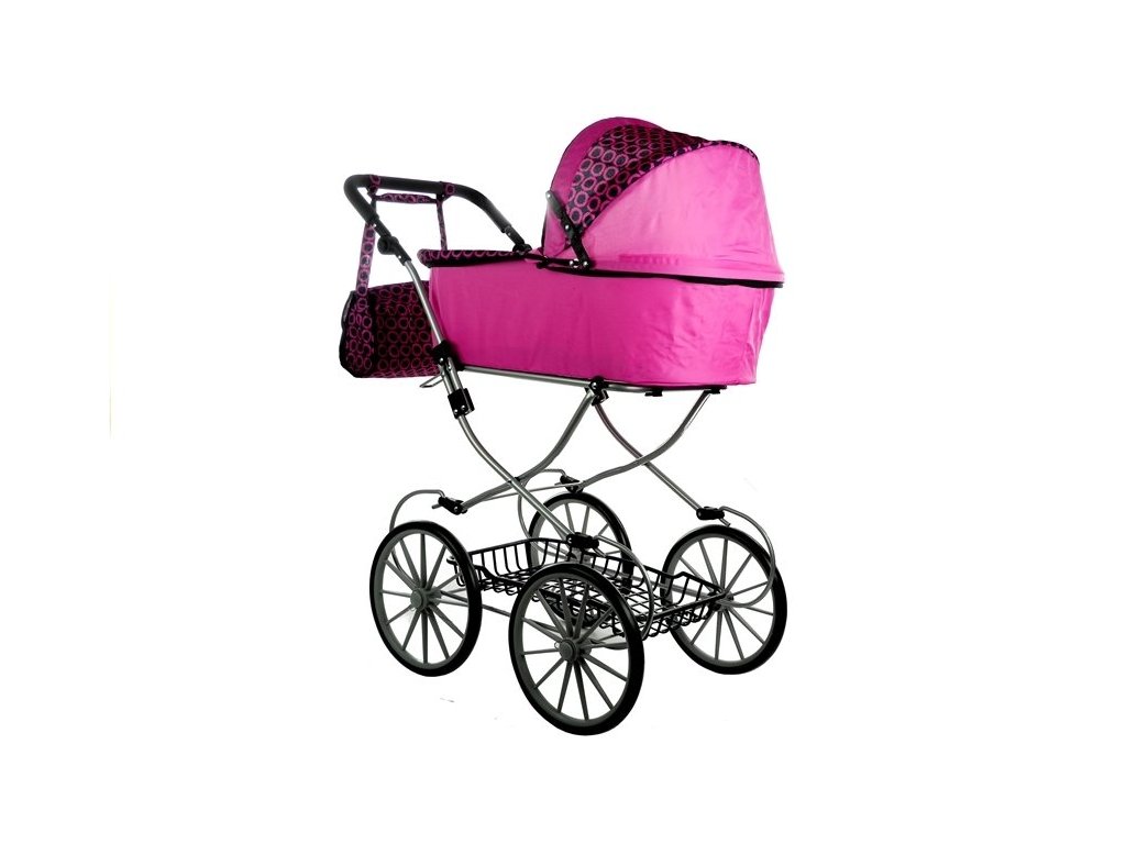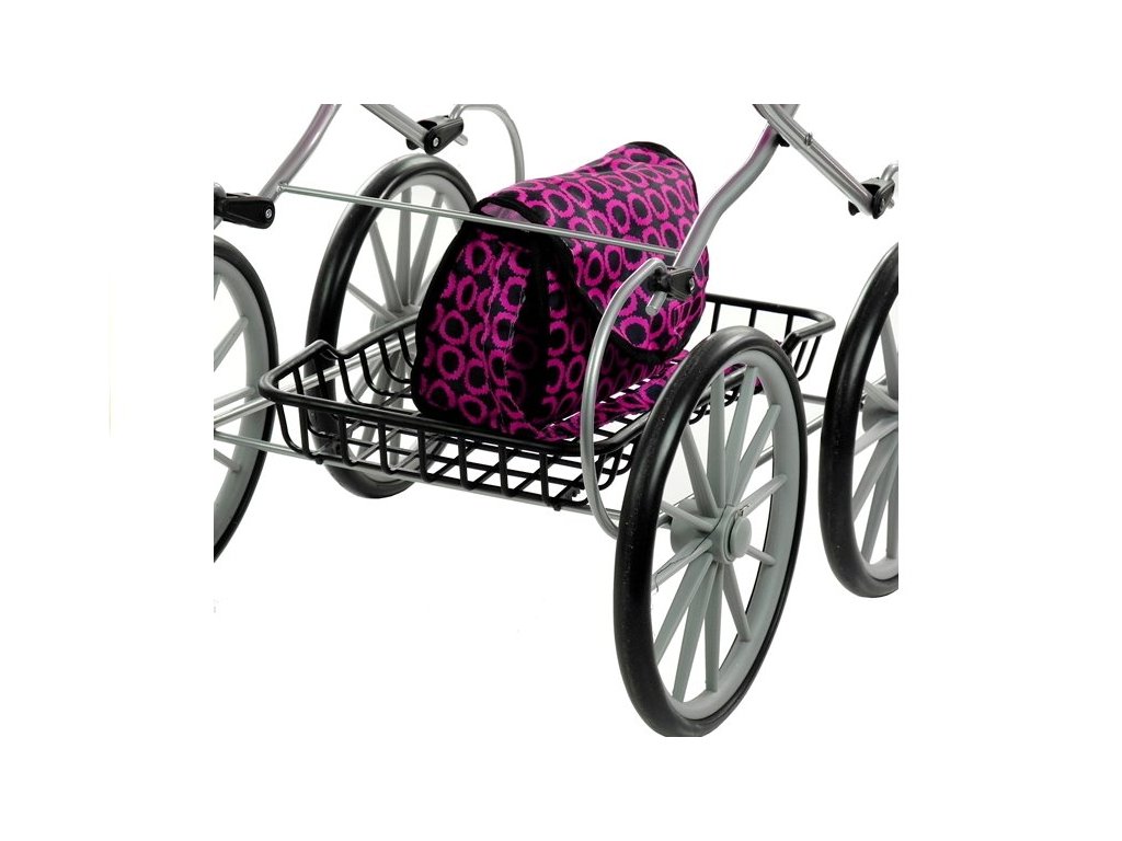 Va prezentam un carucior retro in roz cu detalii negre. Îl recomandăm în principal datorită designului său excelent, care se referă la stilul retro, atrage atenția prin roțile înalte, subțiri și, de asemenea, prin forma elegantă, simplă. Căruciorul va fi potrivit pentru toate păpușile și jucăriile cu lungimea maximă de 69 cm. Căruciorul este ușor, ușor de manevrat, ușor de pliat și ocupă surprinzător de puțin spațiu, așa că îl poți împacheta cu ușurință în mașină.