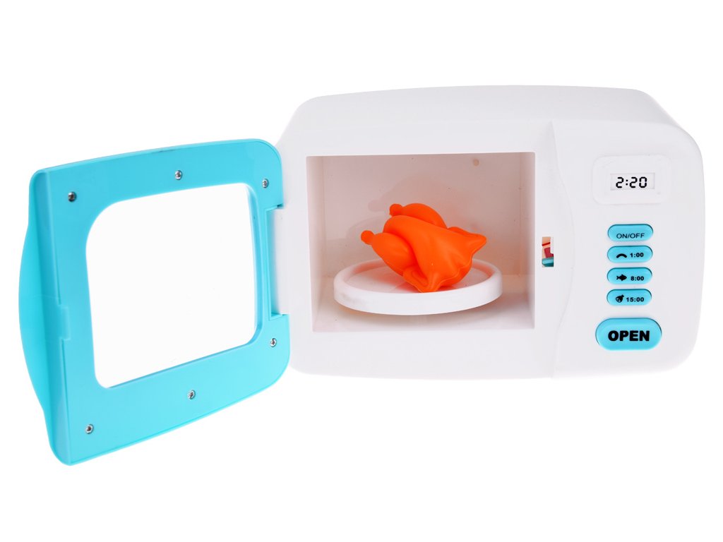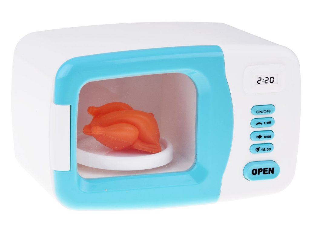 Un cuptor cu microunde de jucărie este un echipament esențial în fiecare colț de bucătărie pentru copii. Copiilor le place să pregătească delicii pentru ursuleții și păpușile lor, așa că acest cuptor cu microunde va mulțumi cu siguranță fiecare mic bucătar. Cuptorul cu microunde are un comutator ON/OFF care, la apăsare, activează dispozitivul de încălzire a alimentelor. În interiorul cuptorului, puiul se rotește pe o placă turnantă. Interiorul cuptorului cu microunde este iluminat de o lampă roșie atunci când este pornit. Butonul ON/OFF este responsabil pentru pornirea și oprirea cuptorului cu microunde, în timp ce butonul OPEN este folosit pentru a deschide ușa. Această jucărie dezvoltă imaginația copiilor și stimulează interesul pentru gătit și pregătirea mâncărurilor, învățând totodată copiii să-i ajute pe alții din casă.