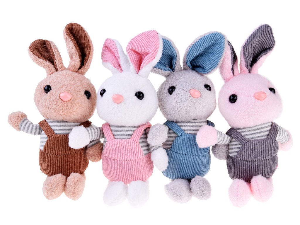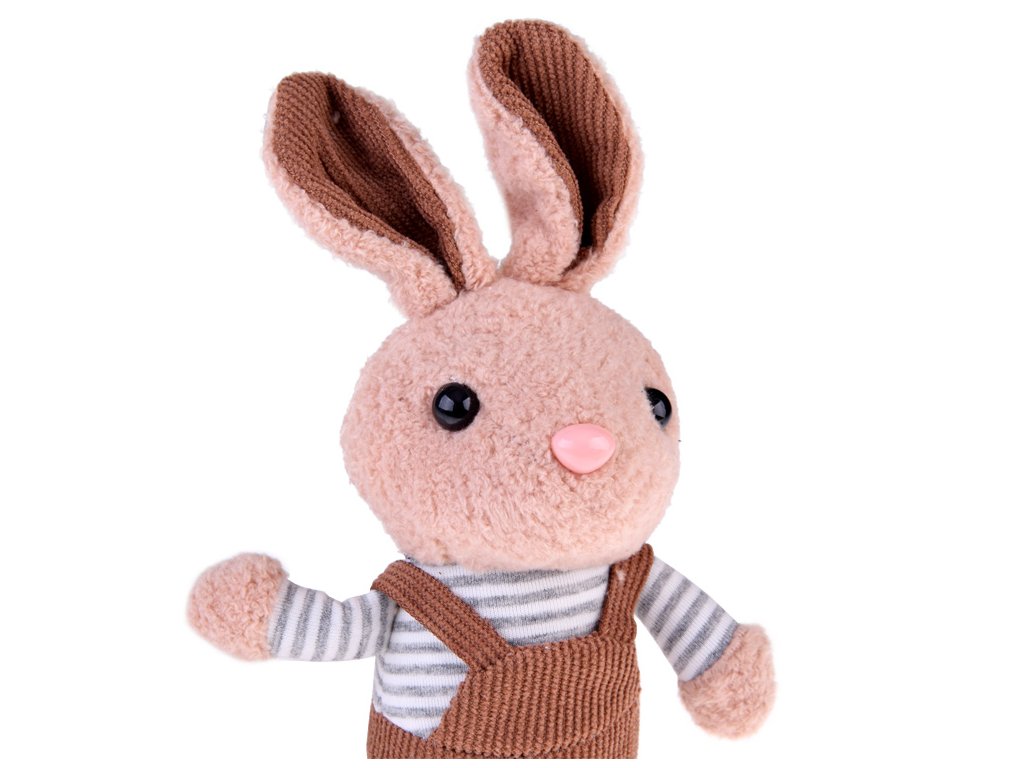 Iepurașul are ochi de plastic, un nas roz și urechi drăguțe. Este îmbrăcat cu bretele scurte și un tricou cu mâneci lungi în dungi.