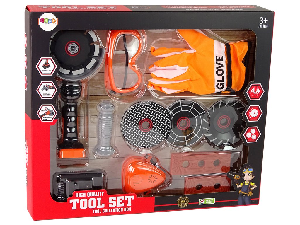 Trusa de bricolaj are cele mai necesare instrumente pentru a face treburi simple casnice. Acum, impreuna cu tata, copilul tau poate incepe bricolajul.Joaca cu setul prezentat va afecta pozitiv dezvoltarea copilului. Copilul nu numai că se va simți responsabil, dar jocul îi va sprijini și dezvoltarea.El va învăța reparații de bază, va dezvolta abilități manuale, acuratețe și gândire logică. Divertismentul creează extrem de dependență. Uneltele sunt bine făcute și rafinate, realizate în întregime din plastic. În interior există 13 elemente care permit un pic de reparații . Un set de astfel de jucării vă va permite și să lucrați împreună în garaj sau grădină, unde toată lumea va putea folosi instrumente adaptate unul altuia. Polizorul are un maner rosu cu elemente negre, se misca cu butonul de pe maner, cadranul incepe sa se roteasca.