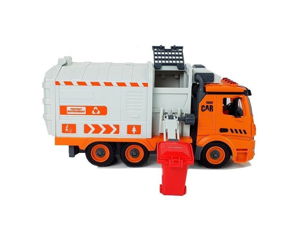 Mașina de jucărie de pe acoperișul cabinei are 4 butoane care declanșează sunete și efecte de lumină. Setul contine 4 recipiente. Rampa din spate se deschide pentru a arunca cu ușurință gunoiul și pentru a goli tomberonul.