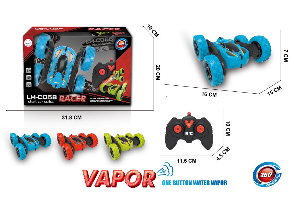 Experimentați o cursă plină de adrenalină cu o mașină cascadorie RC, capabilă nu doar de viteză, ci și de uimitoare rotiri la 360° și cascadorii. Datorită designului pe două fețe, nu rămâne niciodată răsturnată – continuă să ruleze chiar și după ce s-a răsturnat. Efectul special de vapori de apă adaugă și mai mult spectacol și distracție acțiunii.