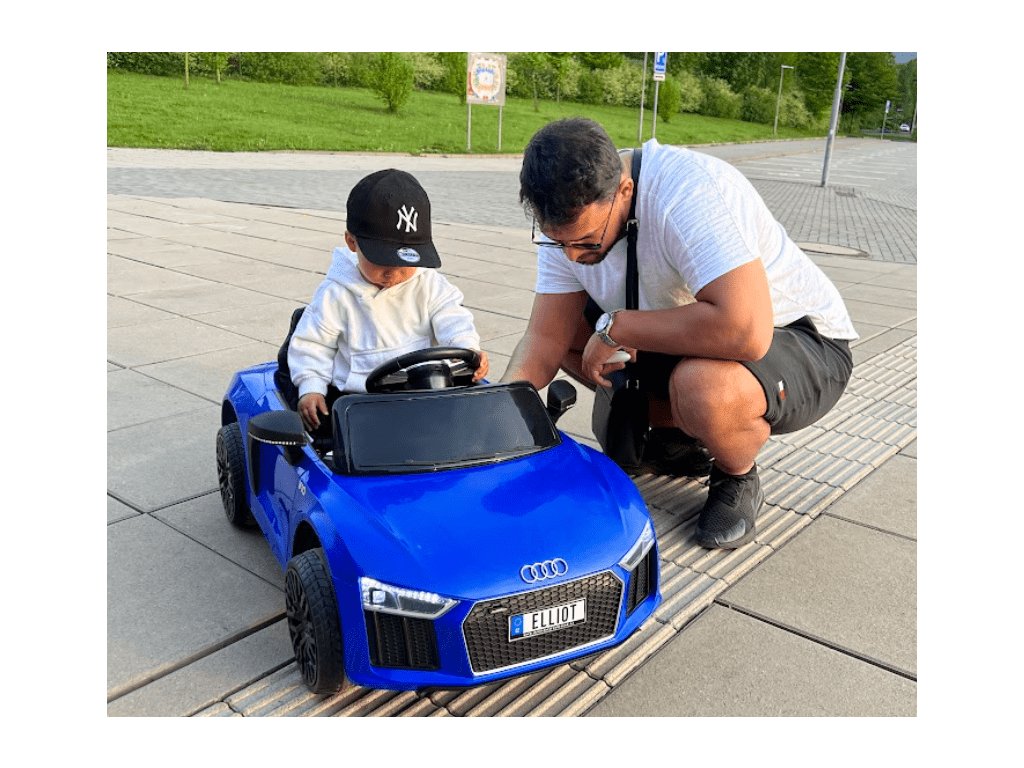 Mașinuța licențiată Audi R8 Spyder pentru copii vine pe roți moi din spumă Eva, care sunt silențioase și se adaptează la diferite tipuri de teren. Copilul se va așeza pe scaunul confortabil din piele ecologică, iar centurile de siguranță vor asigura siguranța.