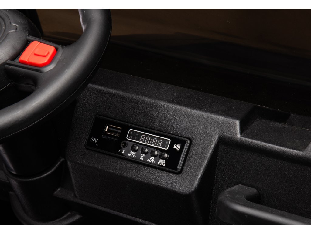 Copilul se va așeza pe un scaun moale, confortabil, din piele ecologică. Se poate asculta muzica preferată în mașinuță, datorită panoului audio de pe bord. Poate verifica starea bateriei, cu ajutorul indicatorului de încărcare a bateriei.
