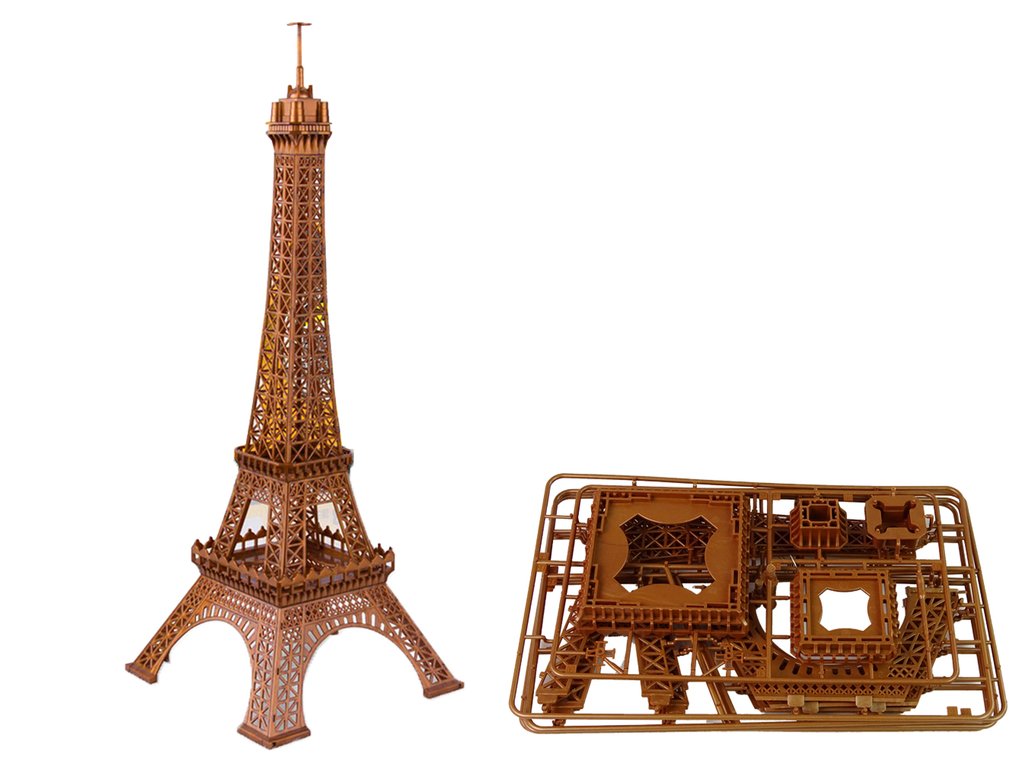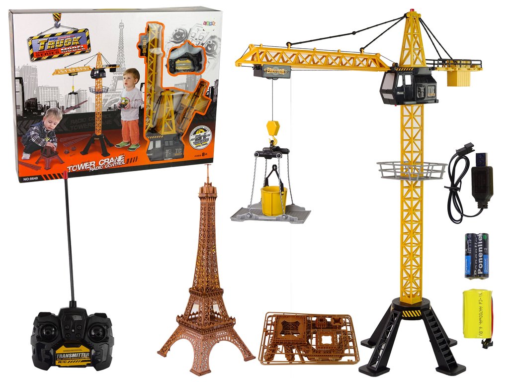 Setul include o macara cu accesorii, Turnul Eiffel pentru auto-asamblare și o telecomandă pentru controlul macaralei.