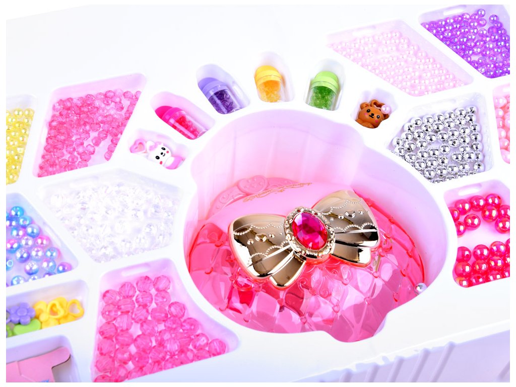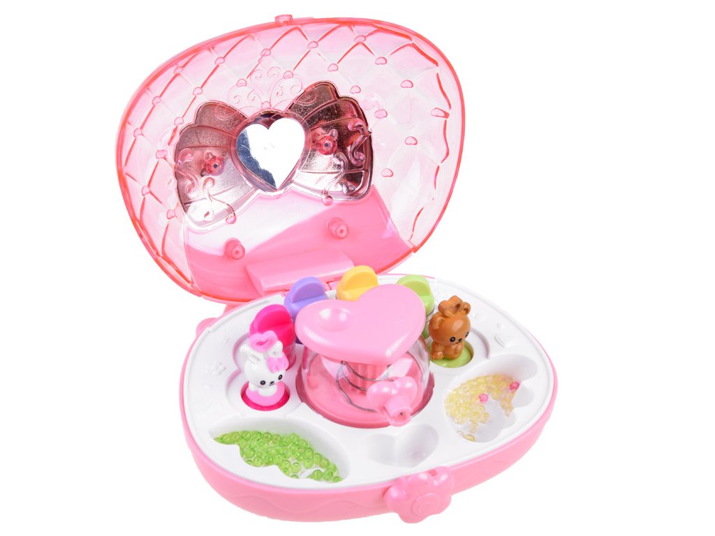 Setul include, de asemenea, o cutie care se poate încuia cu un recipient pentru înșirare mărgele. Găurile din cutie trebuie umplute cu margele care vor fi folosite în acel moment.