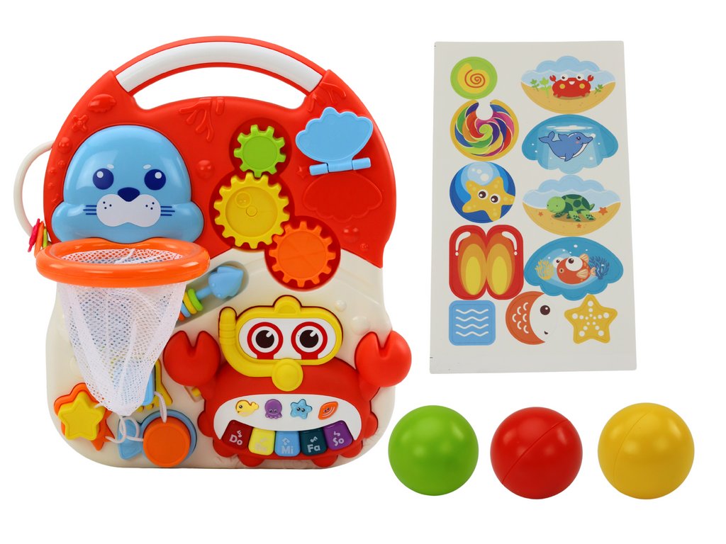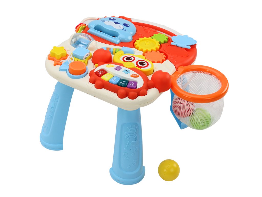 Există, de asemenea, o altă atracție - un coș în care puteți arunca bile de zdrăngănitoare colorate, care dezvoltă în continuare abilitățile manuale ale copilului și coordonarea mișcărilor.