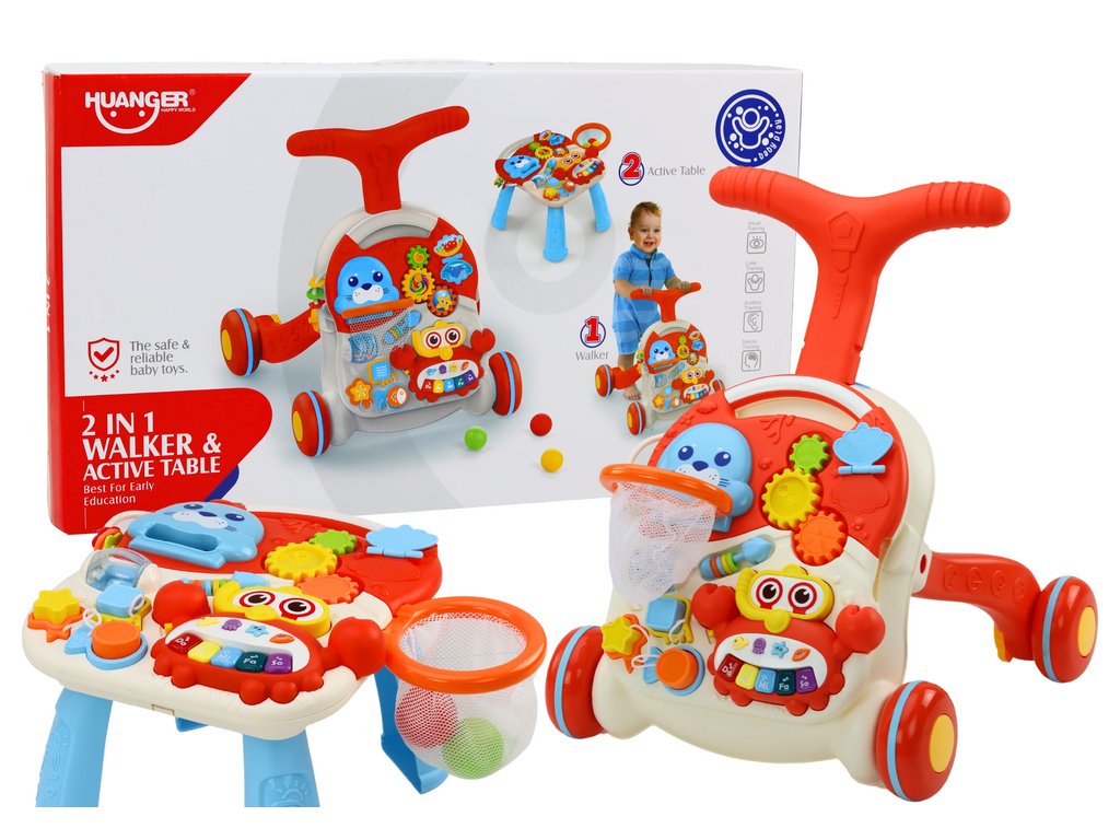 Walkerul nostru servește și ca o masă funcțională care poate fi ușor transformată. Doar scoateți panoul educațional de pe structura premergătorului și atașați picioarele de el. Datorită acestui fapt, copilul tău capătă o nouă dimensiune a distracției, cu o masă confortabilă care atrage atenția și încurajează activitatea.