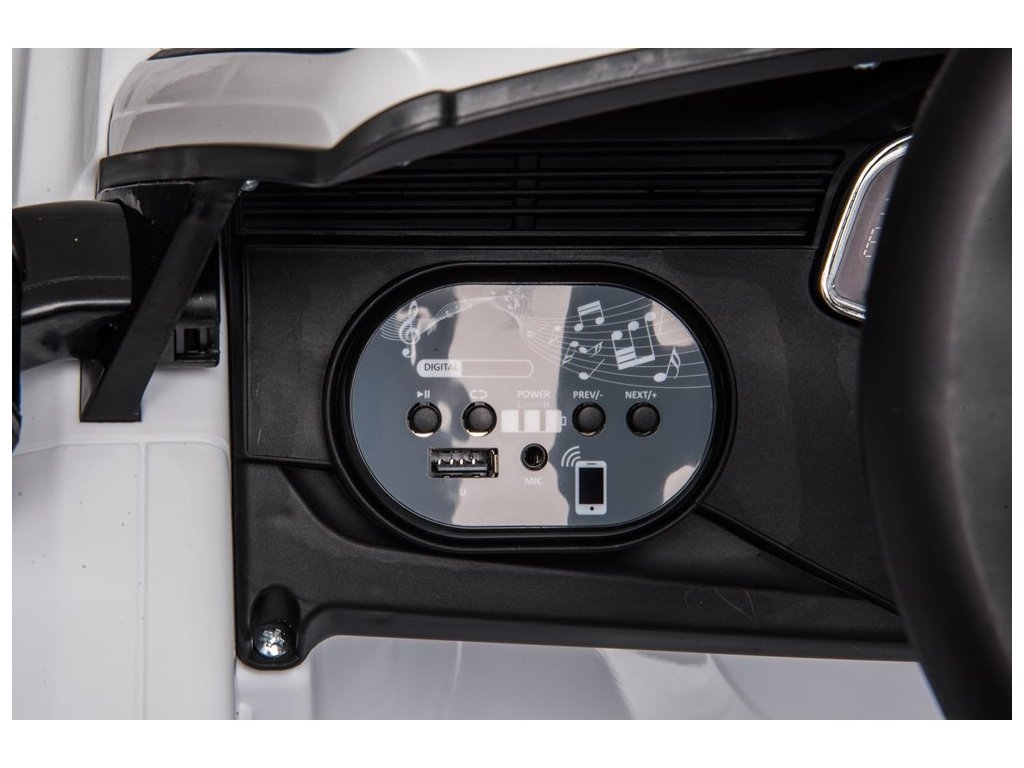 Interiorul este echipat cu un panou muzical cu intrari MP3, USB, Bluetooth si melodii preinregistrate. Volanul are butoane cu efecte sonore. Veți auzi sunete ale motorului la pornirea vehiculului.