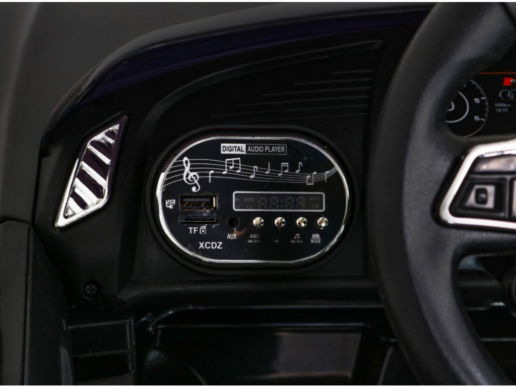 Echipamentul extins include lumini LED din față și din spate și un panou muzical cu intrări USB, SD, MP3 și AUX. Mașina de jucărie are melodii preînregistrate și un claxon pe volan.