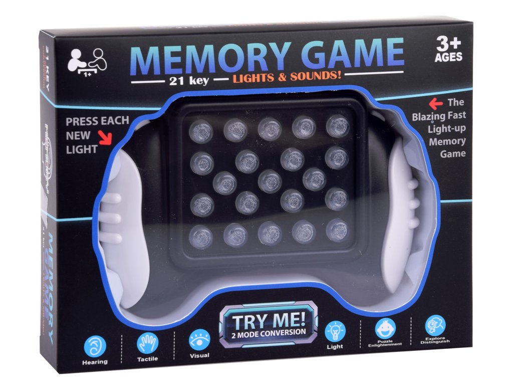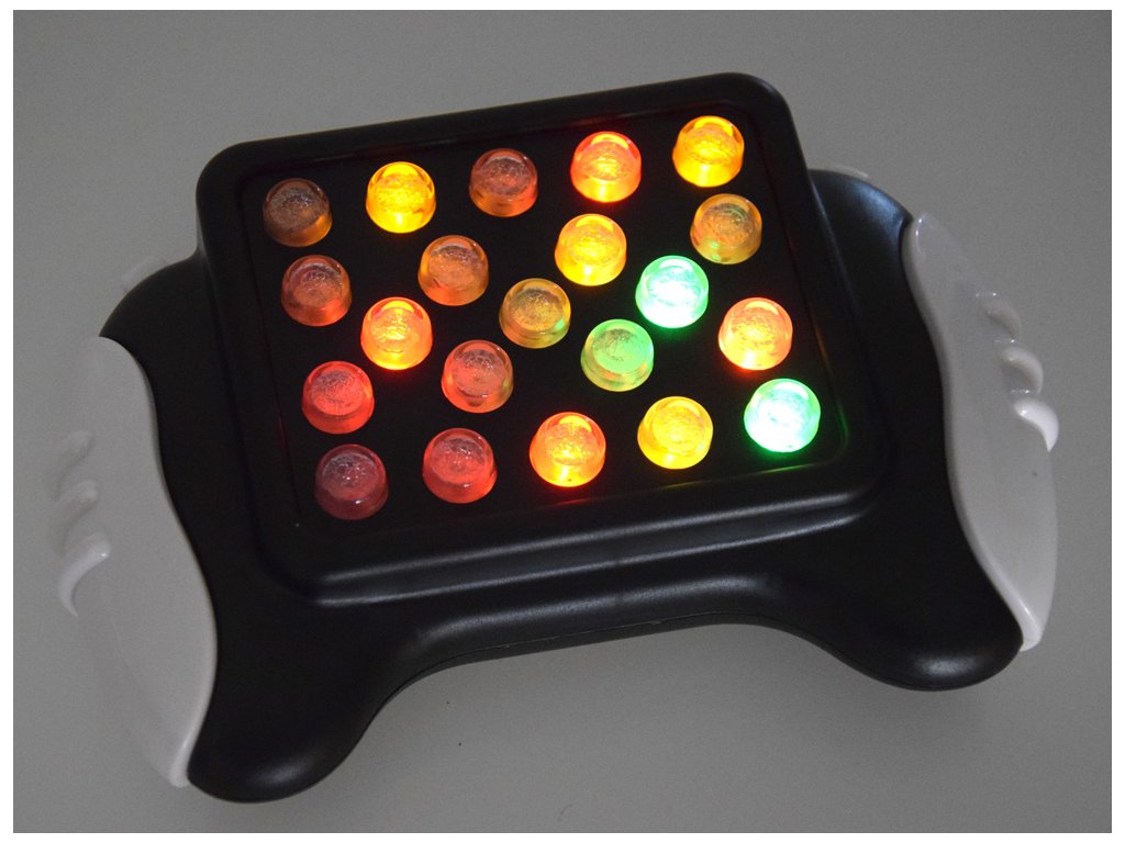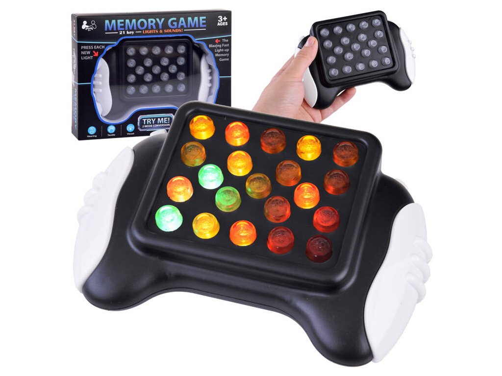 LED-urile individuale de pe panoul consolei se aprind. Vom începe cu 5 elemente consecutive și la fiecare rundă va trebui să memorăm încă un câmp luminos. Avem o singură șansă să îndeplinim sarcina corect. Dacă reușim, vom auzi o melodie veselă și consola va începe să se aprindă în toate culorile. Cu toate acestea, dacă facem o greșeală, vom auzi sunetul pierderii. Pentru a începe un nou joc, trebuie să apăsăm din nou butonul din partea dreaptă a consolei.