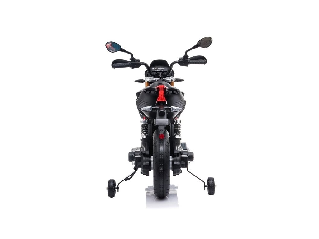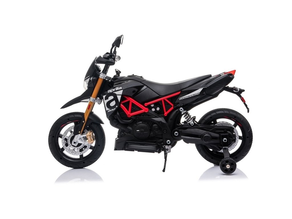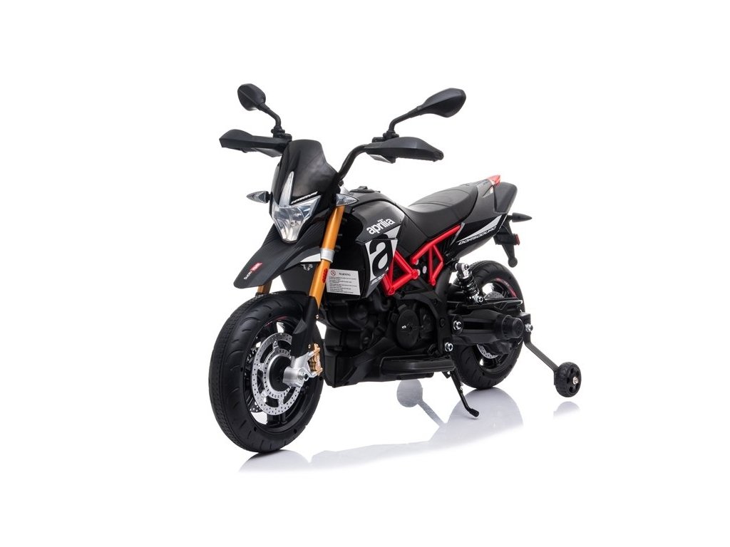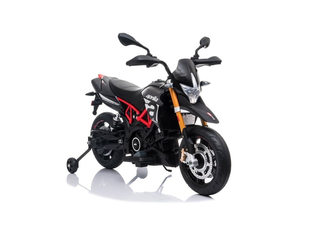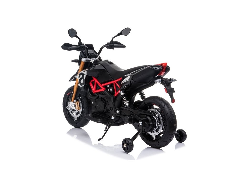 Motocicleta electrica pentru copii Aprilia A007 are doua motoare electrice puternice de 45W si o baterie de 12V 4.5Ah . Copilul stă într-un scaun confortabil din piele ecologică . Alte echipamente includ lumini frontale cu LED-uri și roți din spumă Eva întărită care nu scot un sunet neplăcut la conducere.