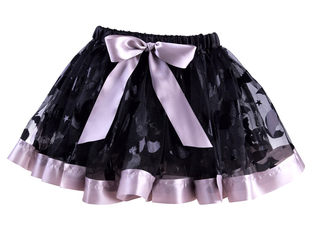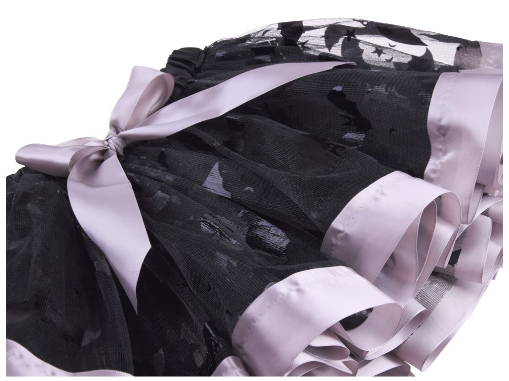 - fuste negre plisate împodobite cu ornamente din satin argintiu cu motive de lilieci și stele,