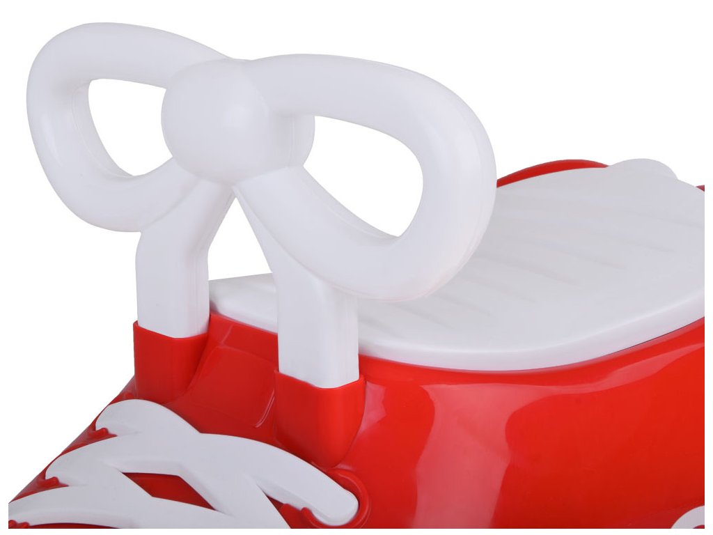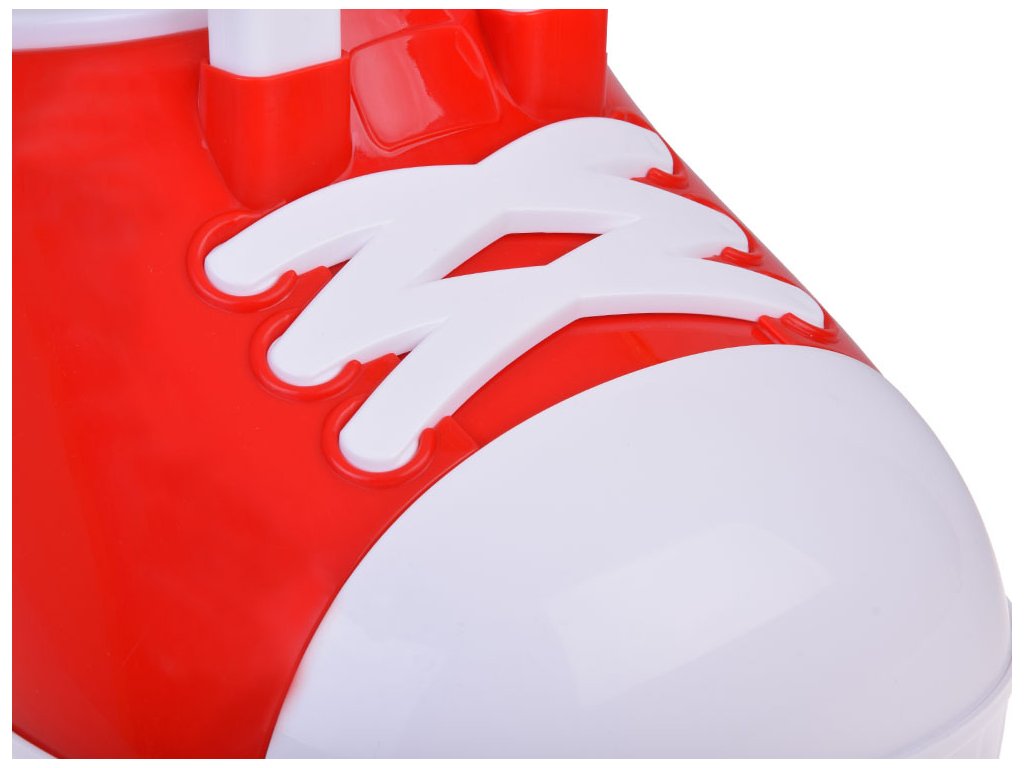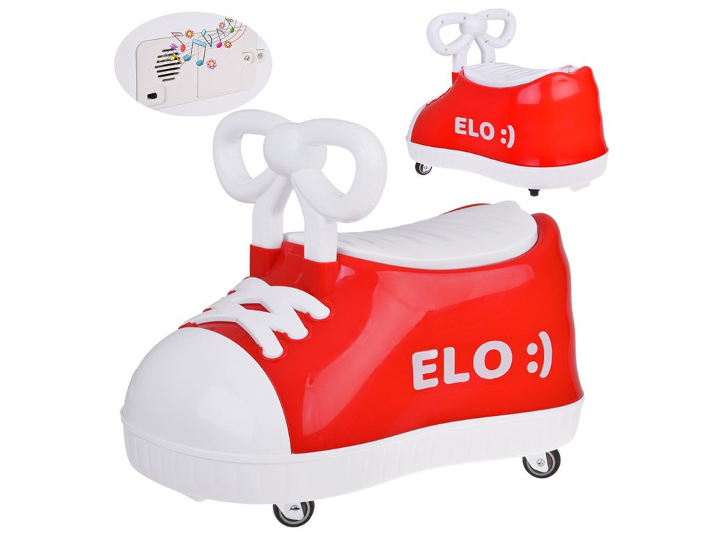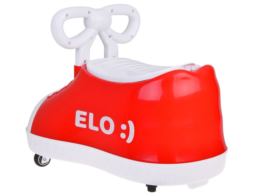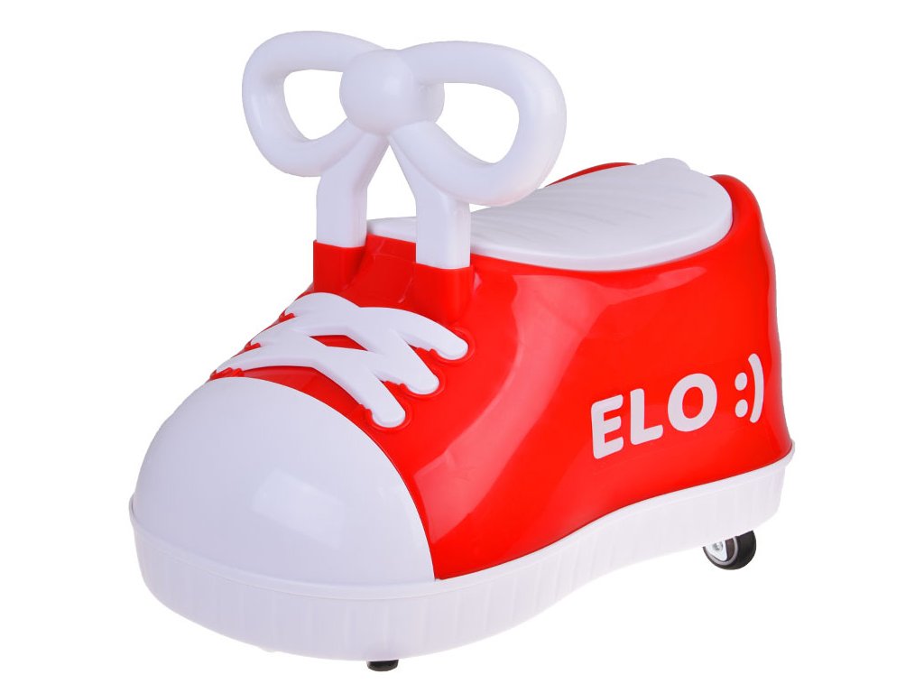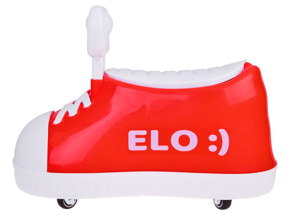 Bicicleta de echilibru roșie, în formă de pantof sport elegant , cu inscripțiile „ELO :)” și „OLE :)”, este o combinație jucăușă de originalitate, distracție și funcționalitate. Va servi drept o primă plimbare excelentă pentru cei mai mici copii de la 12 luni , susține dezvoltarea echilibrului și a coordonării motorii și garantează că va face râsul nu doar copiilor, ci și adulților. Datorită roților pivotante silențioase și a spațiului practic de depozitare de sub șa, va deveni un partener ideal atât pentru aventurile acasă, cât și în aer liber.