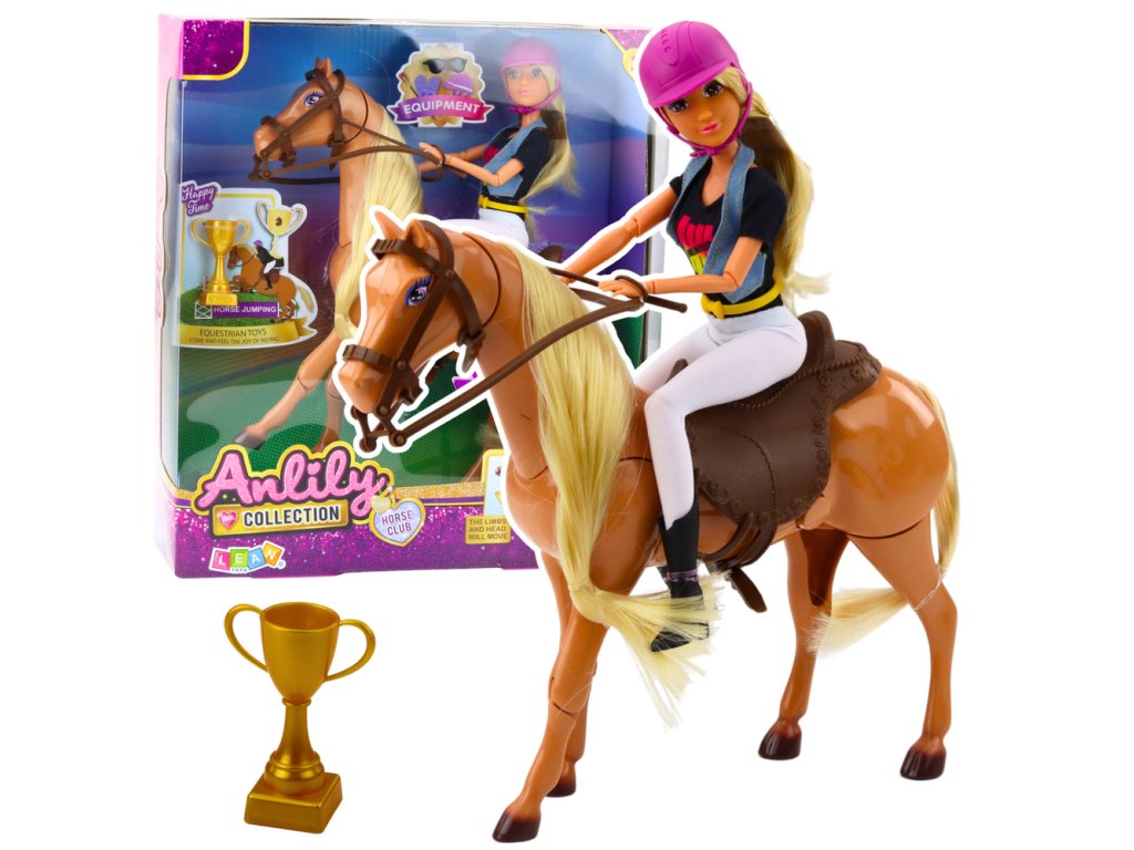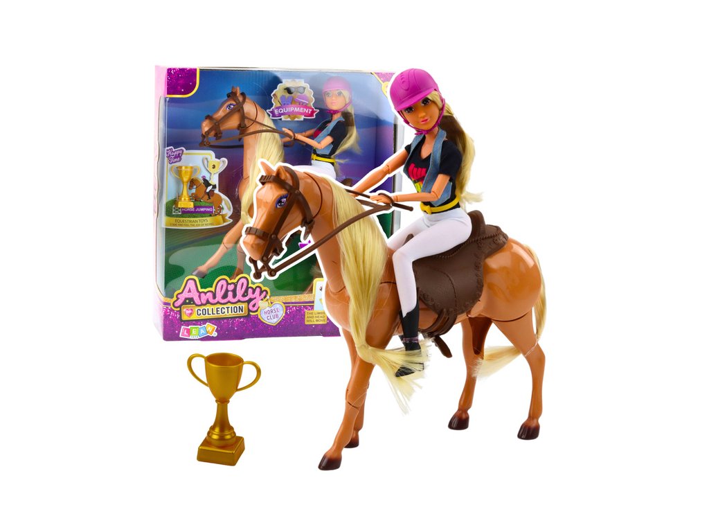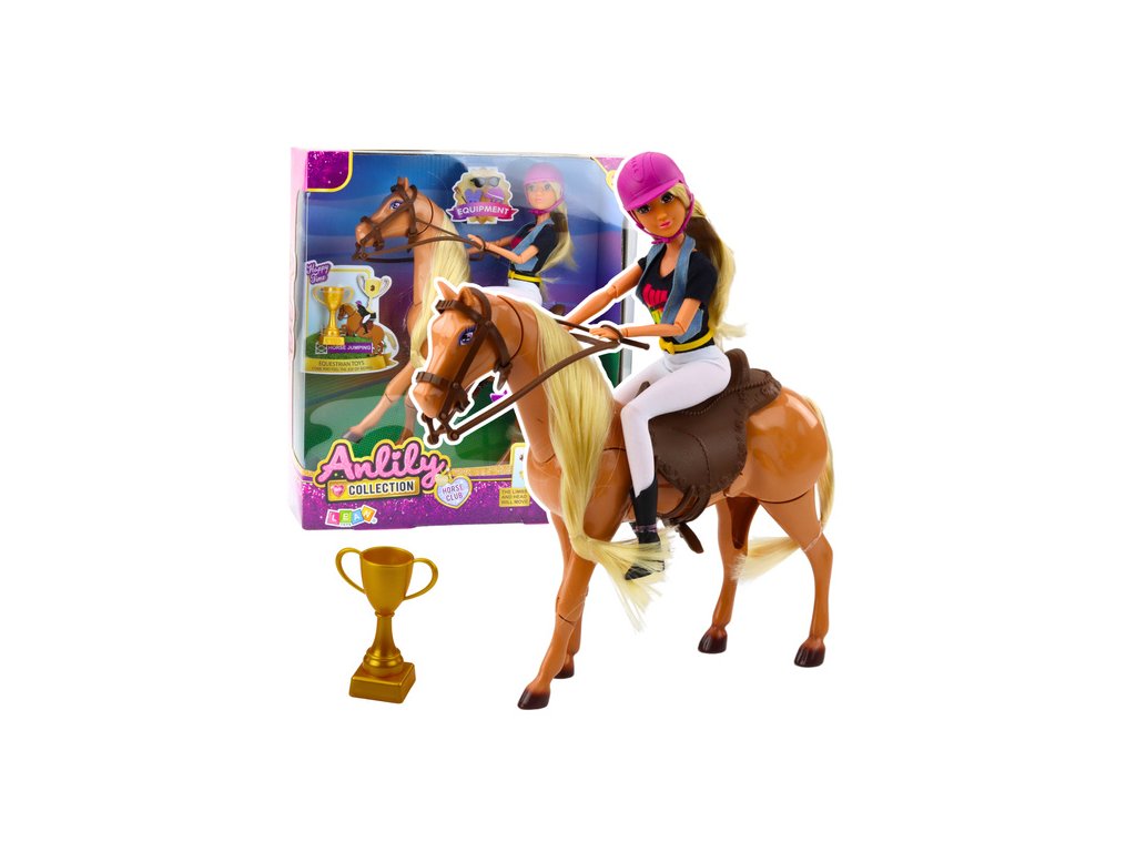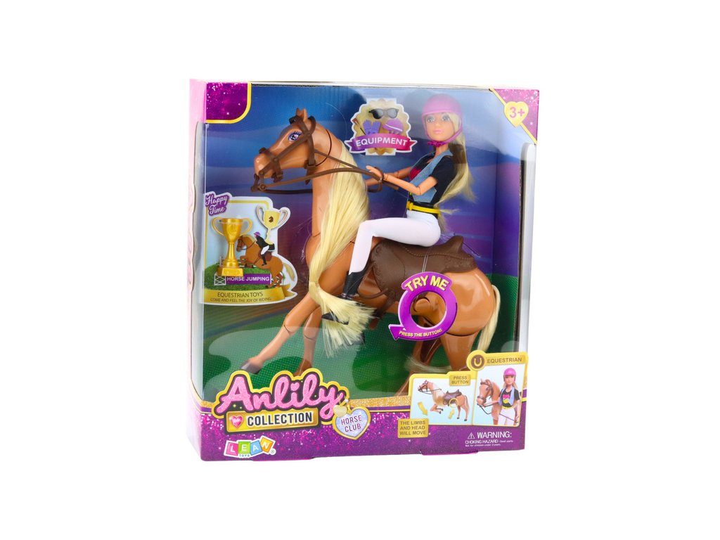 Păpușa Anlily era îmbrăcată ca un jocheu adevărat - purta o ținută specială de călărie, cu o cască de protecție roz și cizme înalte de călărie. Calul ei este un armăsar frumos, maro, cu coamă și coadă lungi, care arată ca un cal adevărat din competițiile hippie. Setul include o șa și un buton special pentru mișcarea membrelor calului , ceea ce face jocul și mai realist.