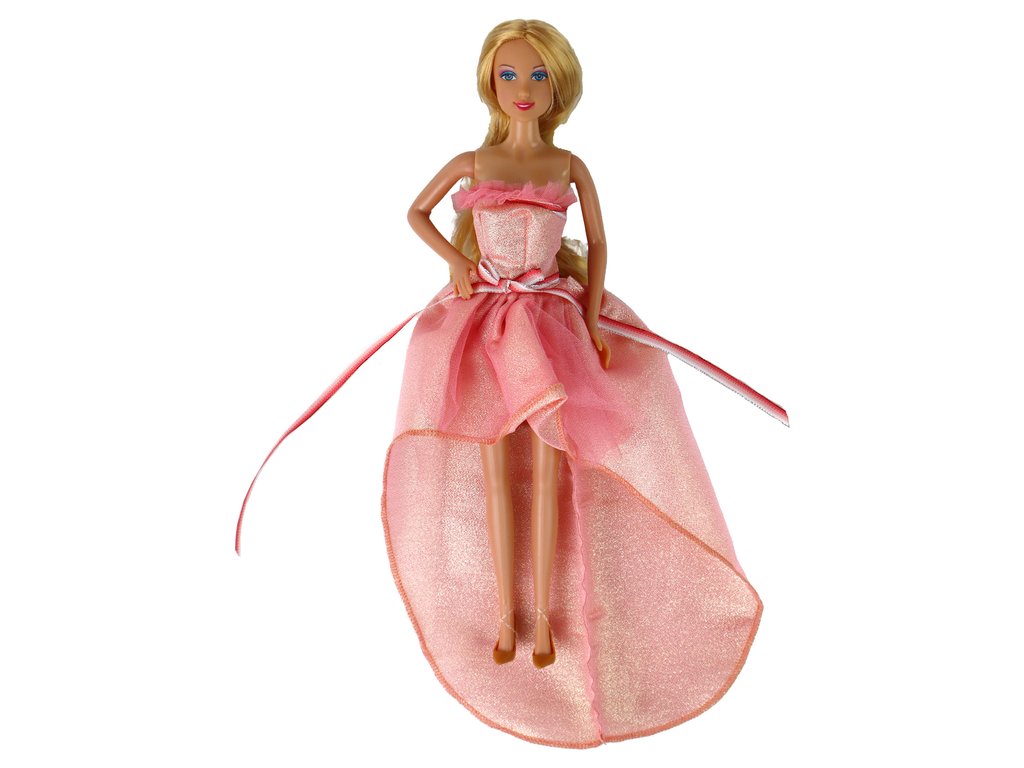 Papusa cu par lung blond, garderoba, pantofi, rochie si accesorii roz