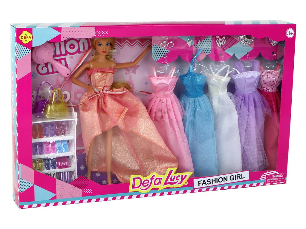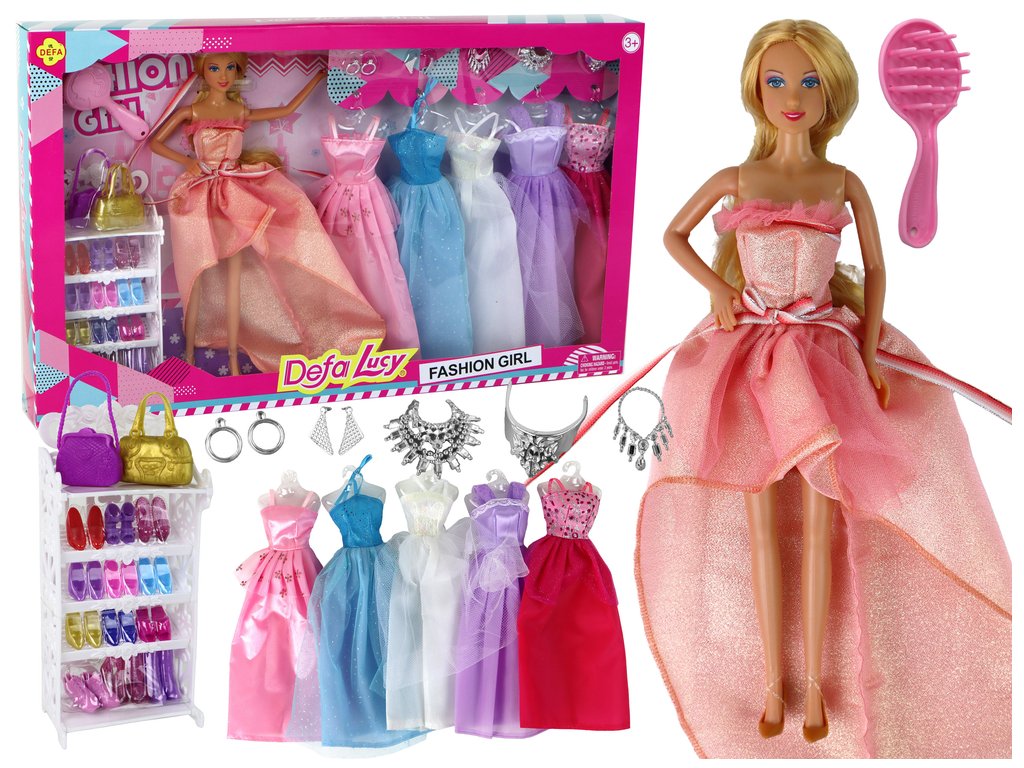 Și asta nu este tot! Setul include si un dulap elegant alb cu 12 perechi de tocuri inalte. Păpușa are până la 5 rochii de seară diferite, inclusiv alb, mov, roz aprins, albastru și roz pal, cu accesorii din tul și ornamente cu sclipici. Setul este bogat si in accesorii, precum 2 perechi de cercei argintii, 2 genti de mana (violet si auriu), 3 coliere, o clema de par si o perie de par.