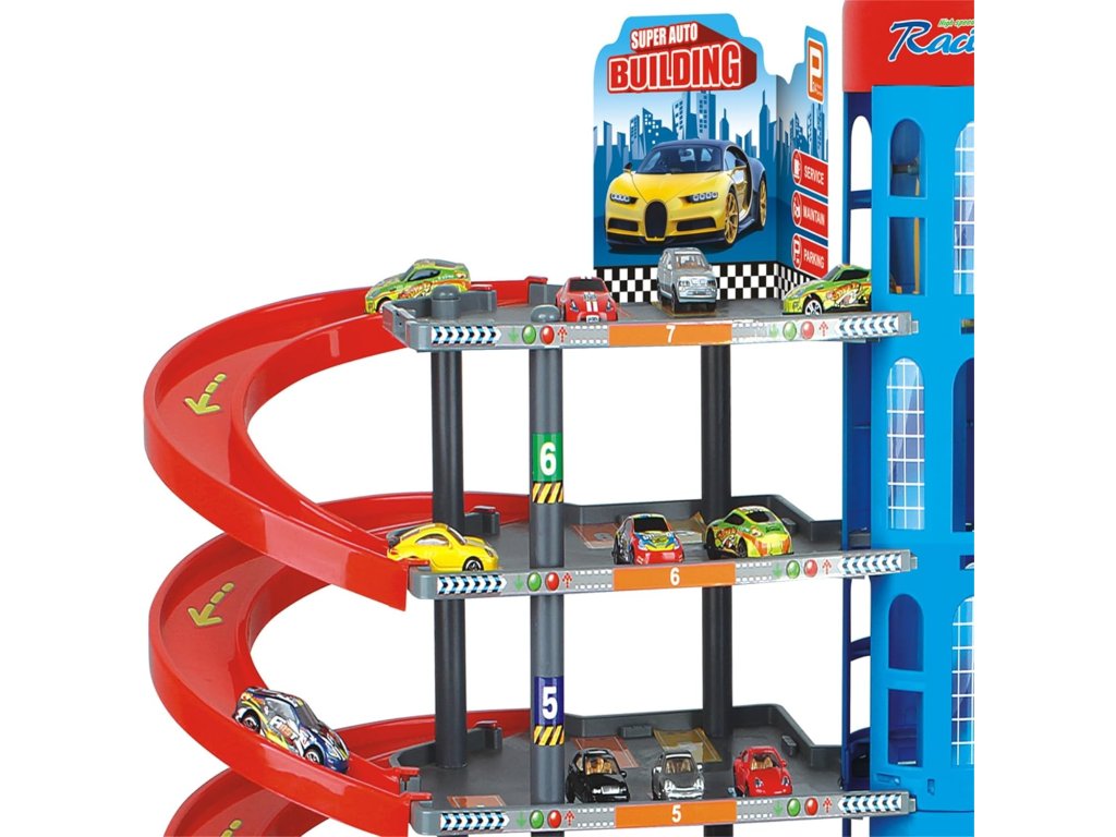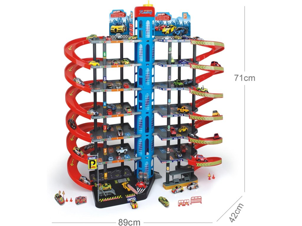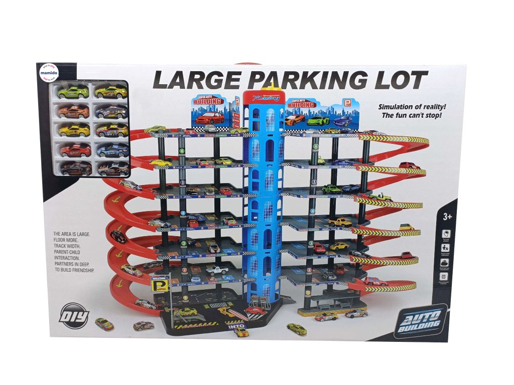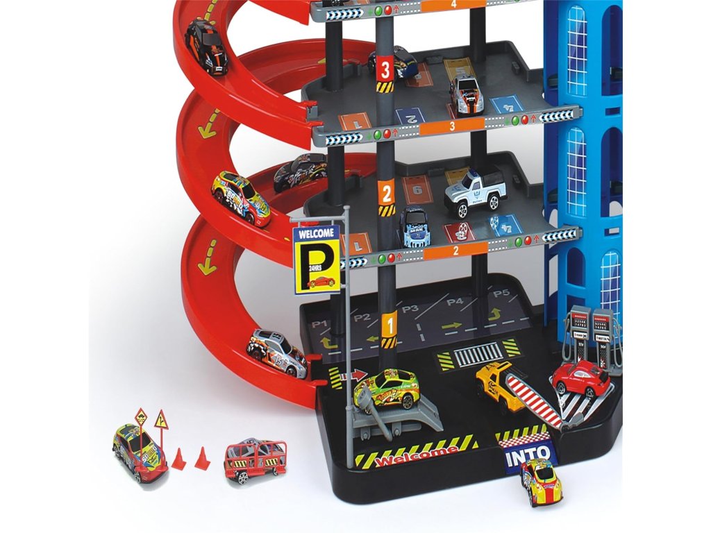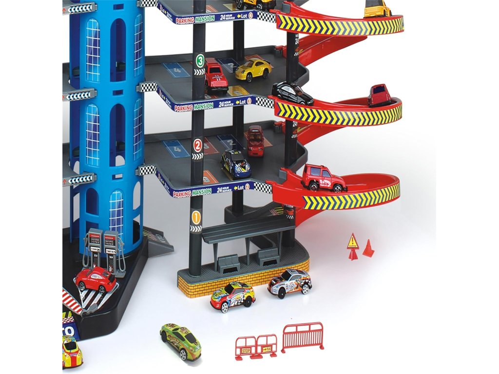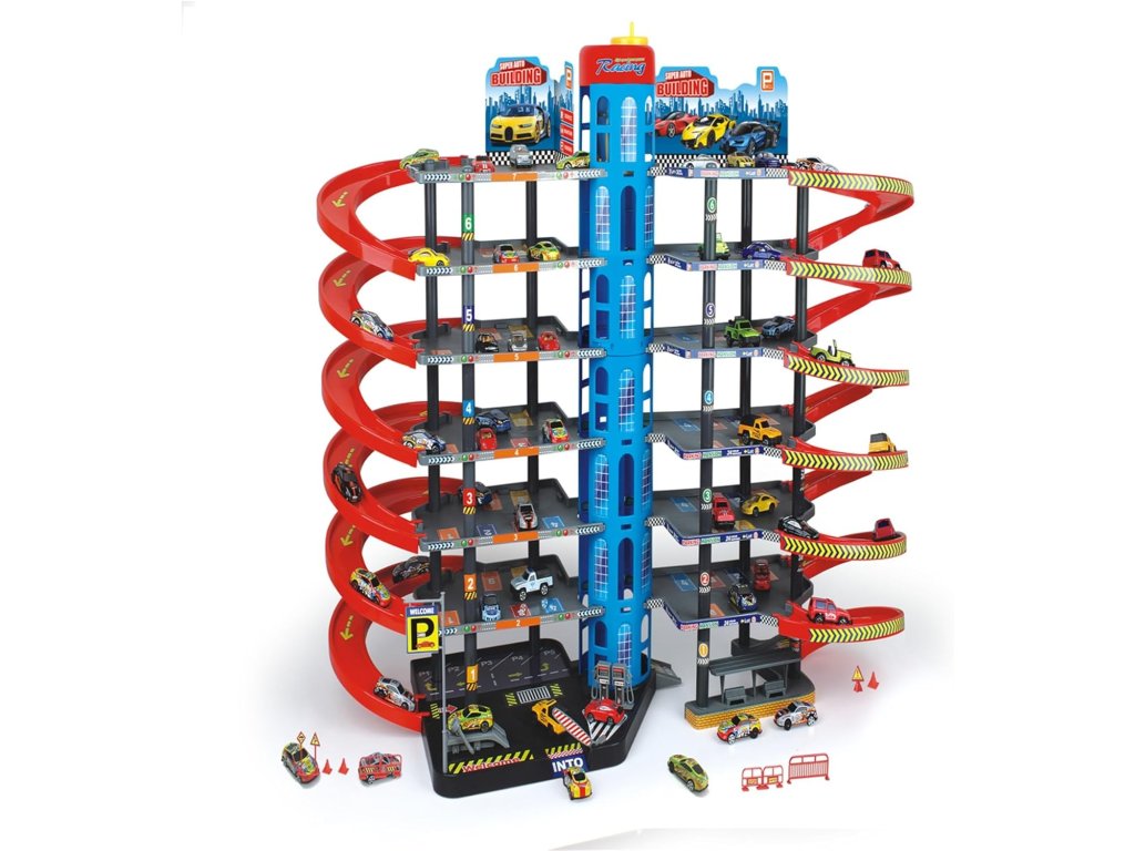 Un mare complex de parcări pe mai multe niveluri aduce copiilor o lume plină de mașinuțe, rampe de urcare, rampe de coborâre și scene de joacă distractive. Acest parc auto multi-etajat oferă mai multe niveluri de parcare, un turn central înalt și rampe lungi în spirală, care permit copiilor să elibereze mașinuțele de sus până jos. Setul include, de asemenea, mașinuțe mici și accesorii pentru o joacă realistă.