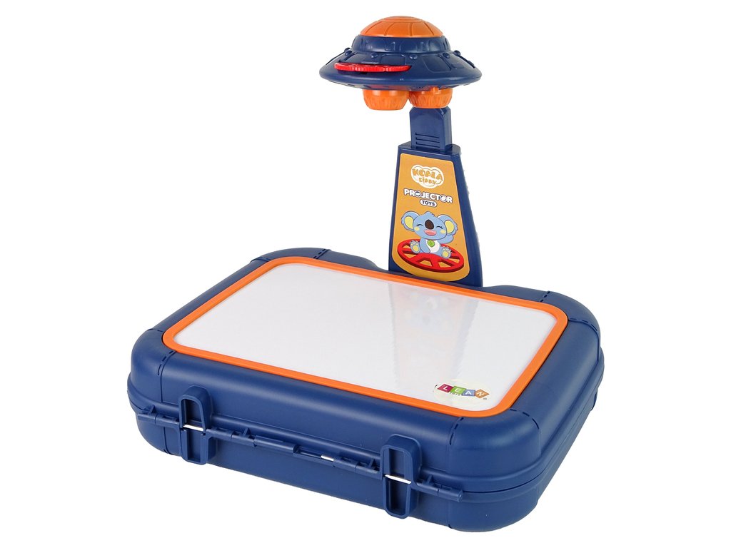 Proiectorul în formă de OZN vă permite să proiectați imagini pe care copiii le pot urmări pe partea albă a valizei. Setul include, de asemenea, 6 markere colorate și un burete de șters, permițându-i copilului să-și exprime imaginația. În plus, suportul vă permite să reglați înălțimea proiecției în funcție de preferințele copilului dumneavoastră.