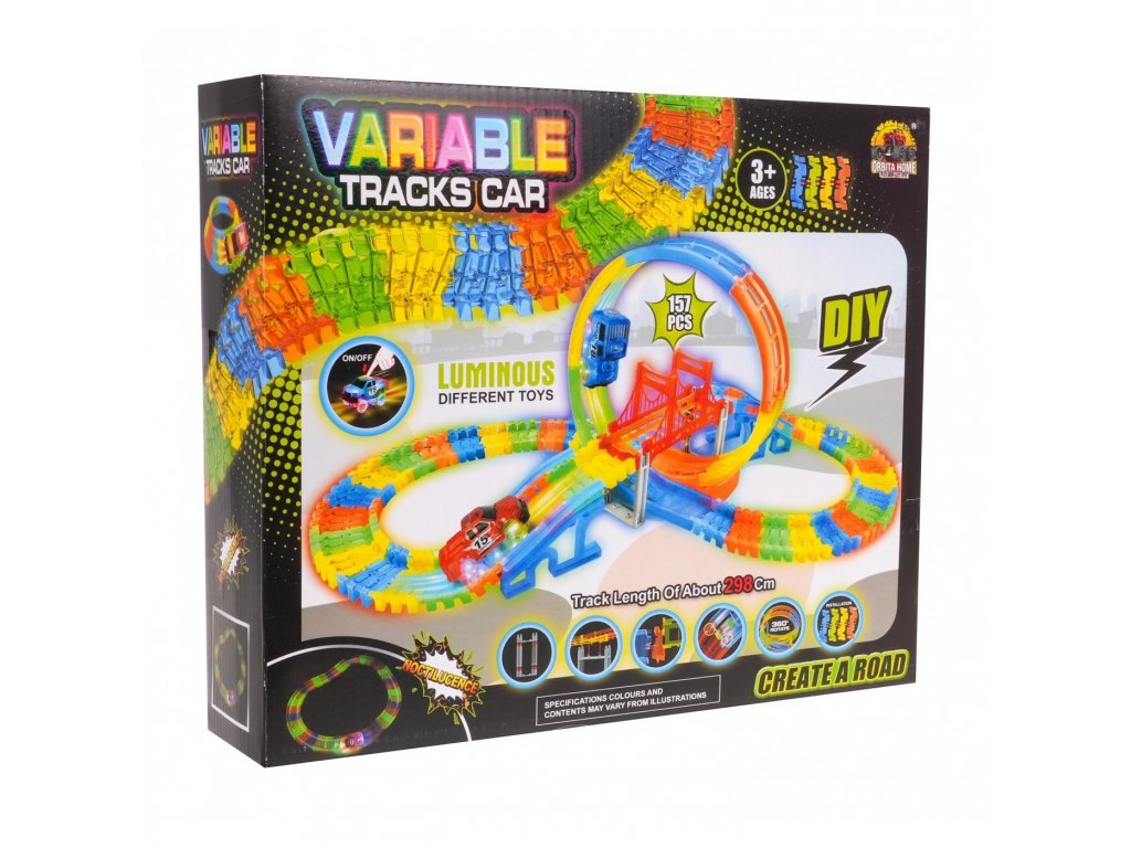 Pista care strălucește în întuneric cu un circuit și o mașină de jucărie atașată este un cadou grozav pentru copiii de la 3 ani. Șenile sunt flexibile, ceea ce permite diferite combinații - le puteți întoarce, le puteți ridica, le puteți transla, chiar și în timp ce conduceți mașina de jucărie. În plus, pistele sunt fluorescente și strălucesc în întuneric. Vehiculul din set are iluminare din spate cu LED , care creează un efect uimitor în timp ce conduceți pe întuneric. Mașina de jucărie este alimentată de 2 baterii AA de 1,5 V (nu sunt incluse). Pentru a porni mașina, apăsați pur și simplu butonul de pe plafon.