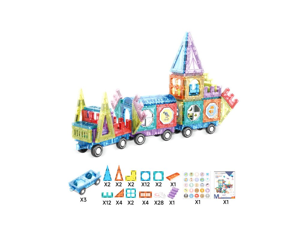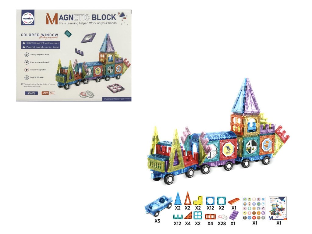 Setul de construcție conține 75 de piese magnetice de diverse forme – triunghiuri, pătrate, arce, panouri lungi, ferestre decorative și piese speciale. Designul transparent în culori vibrante susține percepția vizuală, iar datorită îmbinării simple, chiar și copiii mai mici se pot descurca. Ideal pentru dezvoltarea creativității, a gândirii logice și a imaginației spațiale.