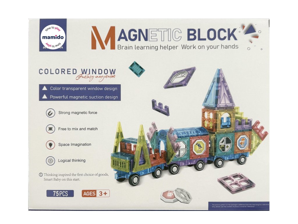 Setul creativ de construcție magnetică permite copiilor să construiască structuri colorate, vehicule și designuri originale datorită celor 75 de piese transparente. Setul include, de asemenea, roți, panouri speciale pentru ferestre și diverse forme, cu ajutorul cărora copiii pot crea, de exemplu, propriul trenuleț magnetic sau un set de transport.