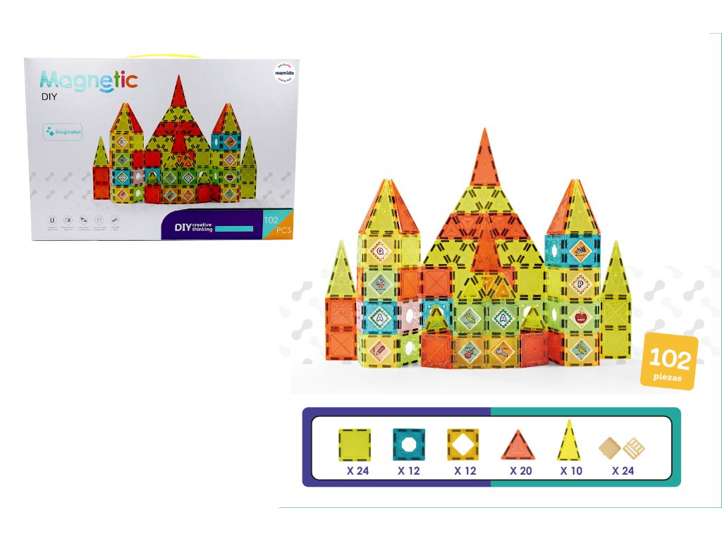 Setul creativ de construcție magnetică este format din 102 piese colorate de 5,5 cm, fiind o alegere excelentă pentru copiii cărora le place să construiască, efectele de lumină și combinarea formelor. Dimensiunea mai mică a pieselor este ideală pentru construcții detaliate, structuri solide și crearea de castele, case și turnuri mai mici. Piesele transparente cu ferestre colorate creează reflexii frumoase de culoare și, datorită magneților puternici, se mențin întotdeauna bine.