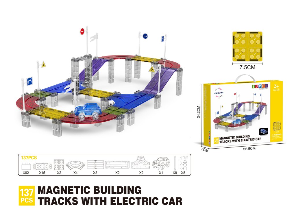 Setul conține 137 de piese magnetice inclusiv piese speciale pentru crearea traseului. Datorită magneților puternici, panourile se conectează ușor, permițând copiilor să experimenteze cu formele și înălțimile traseelor. Mașinuța electrică parcurge singură întregul traseu, oferind o experiență grozavă de mișcare și dezvoltând gândirea tehnică.