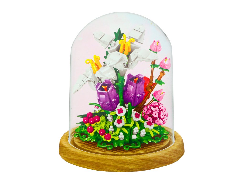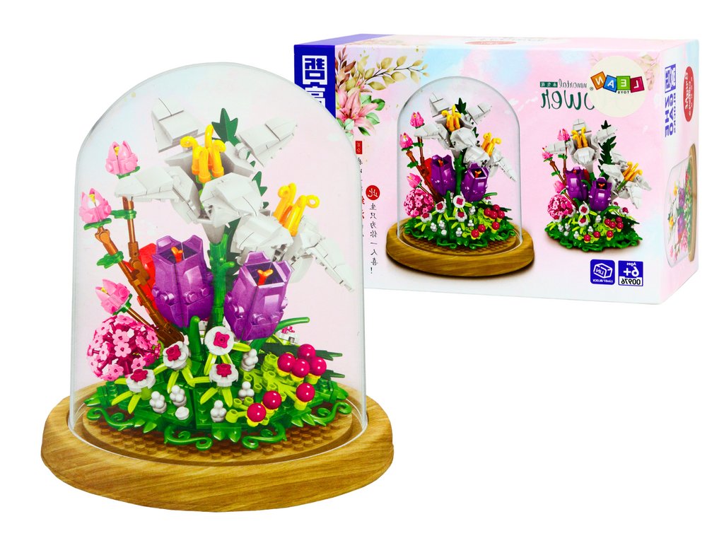 Setul de construcție Floare în sticlă este mai mult decât o jucărie, este o aventură creativă și un obiect decorativ unic. Este format din 487 de piese , inclusiv blocuri colorate, o vitrină și instrucțiuni pas cu pas. Acest set vă permite să creați un decor de neuitat. Instrucțiunile sunt un ghid pentru procesul de creație și permit copiilor și adulților să monteze pas cu pas un frumos buchet de flori. Toată lumea se poate bucura astfel de a-și crea propriul ornament personal, dezvoltându-și în același timp imaginația și dexteritatea manuală.