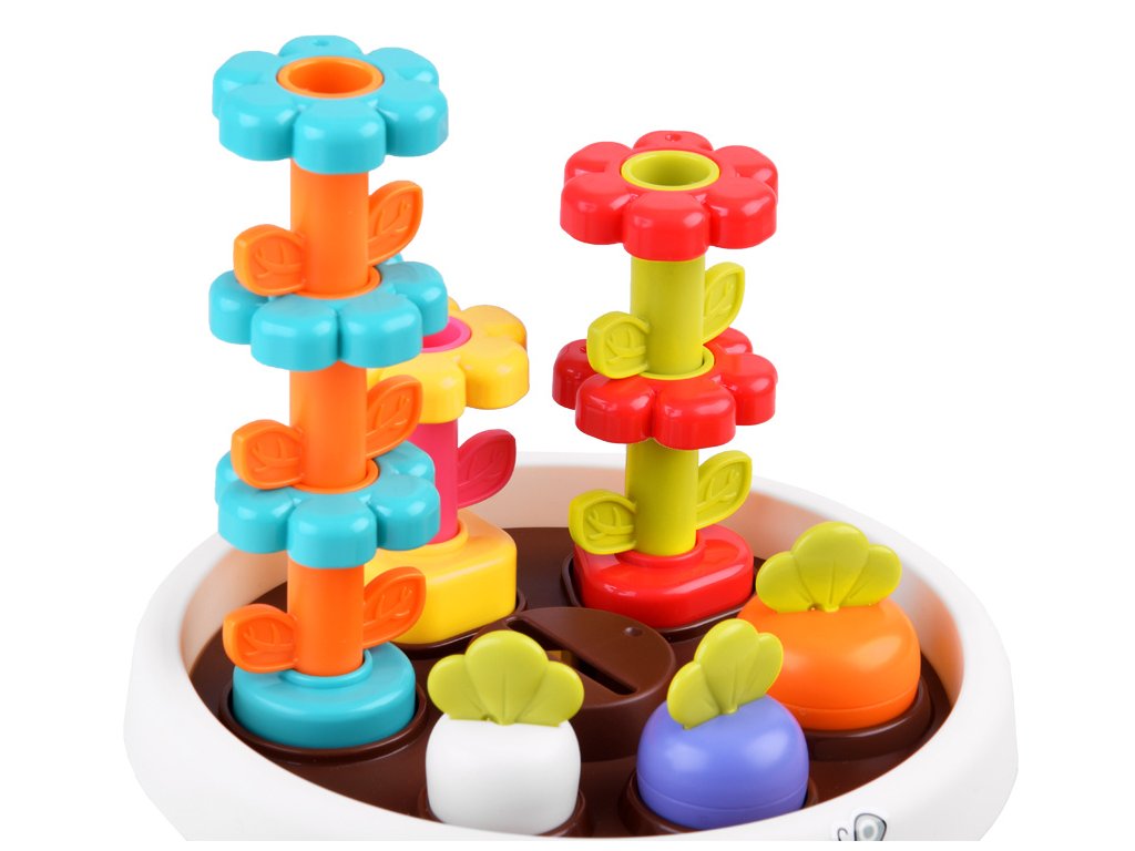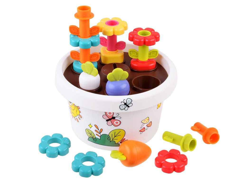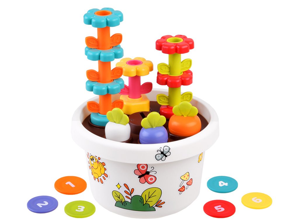 Include 3 morcovi cu magneți la capete. Două dintre ele pot fi separate astfel încât partea inferioară să fie folosită pentru a construi un turn de flori, în timp ce partea superioară a morcovului poate fi completată. Datorită elementelor colorate, copilul învață culorile și formele de bază.