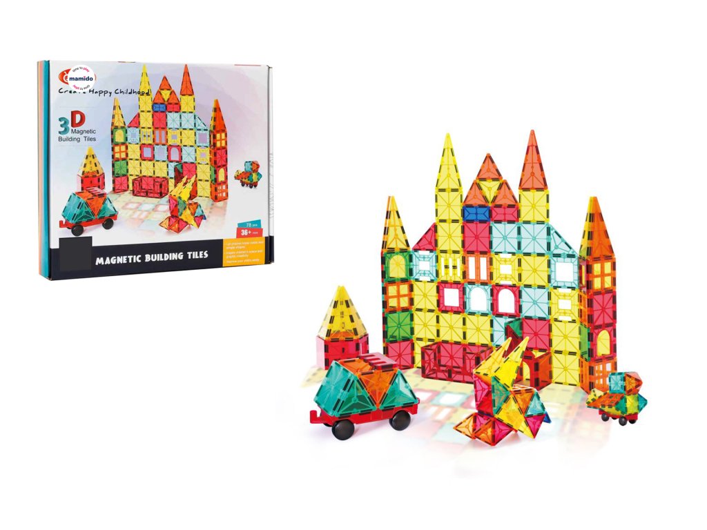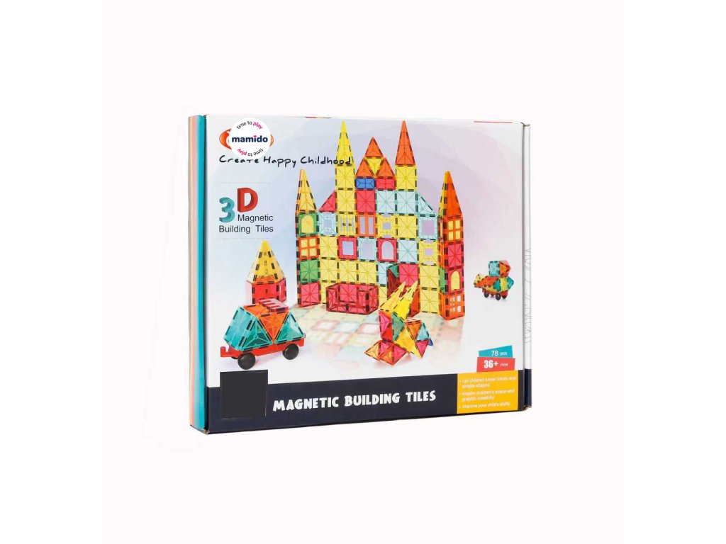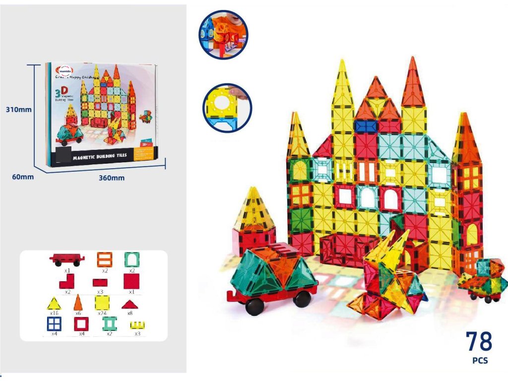 Descoperă posibilități infinite de creație cu setul de construcție magnetic de 78 de piese, care stimulează imaginația și creativitatea copiilor. Datorită conexiunilor magnetice solide, copiii pot construi cu ușurință castele, case, turnuri, vehicule și alte construcții originale.