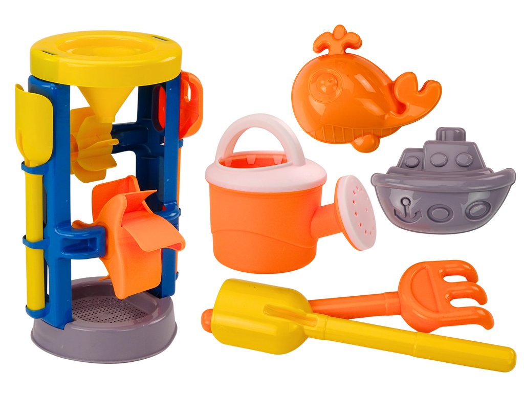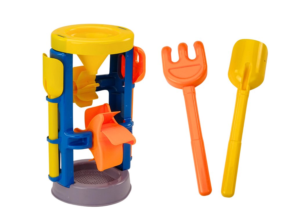 Setul de grădină cu râșniță este un echipament complet pentru micuții pasionați de plajă sau copiii cărora le place să se joace în cutia cu nisip. Elementul principal al setului este o râșniță mare cu două roți, care oferă dublă utilizare: pe de o parte, are o sită practică pentru cernerea nisipului, pe de altă parte, o pâlnie care facilitează dozarea precisă a nisipului în construcții. Această soluție practică face jocul mai eficient și creativ.