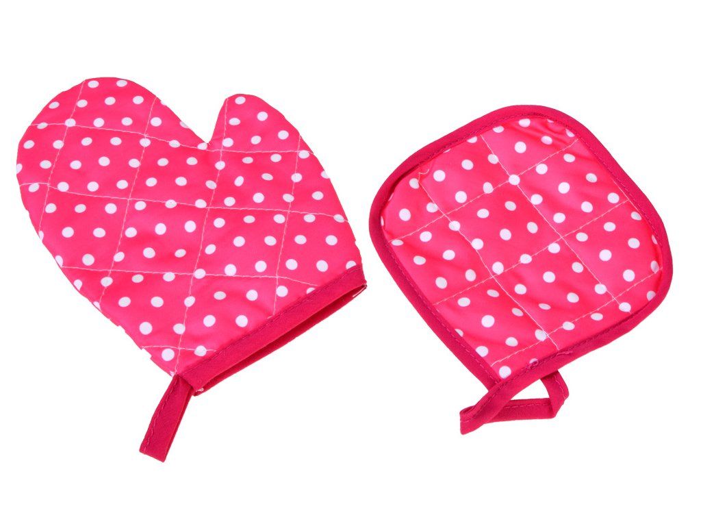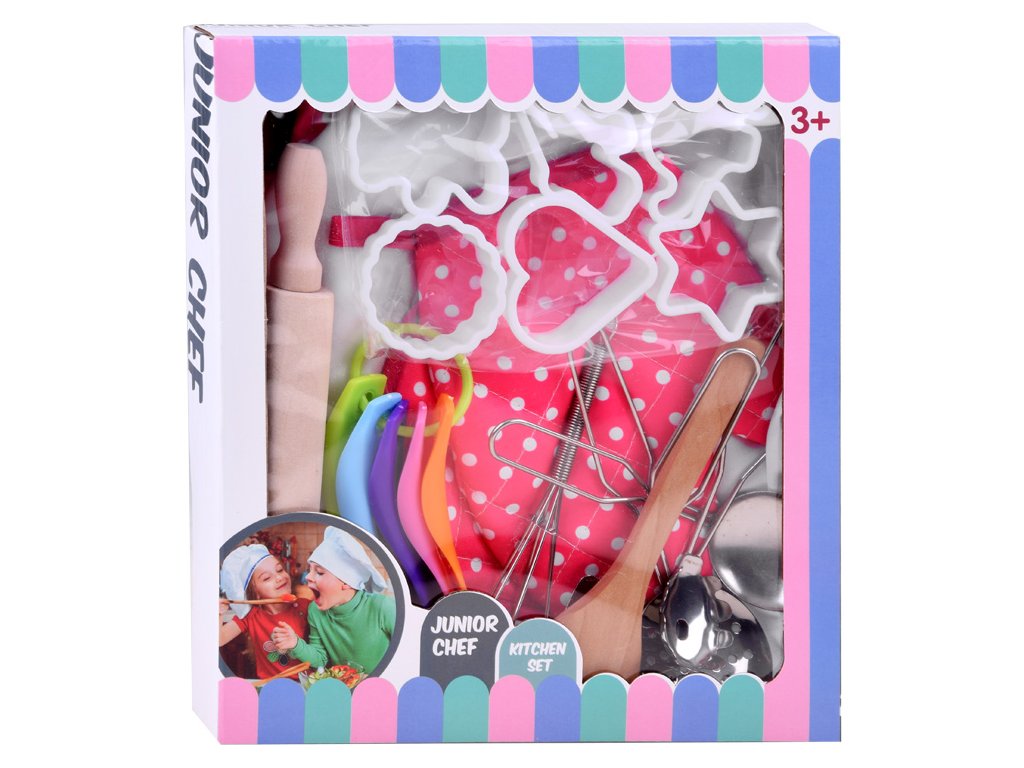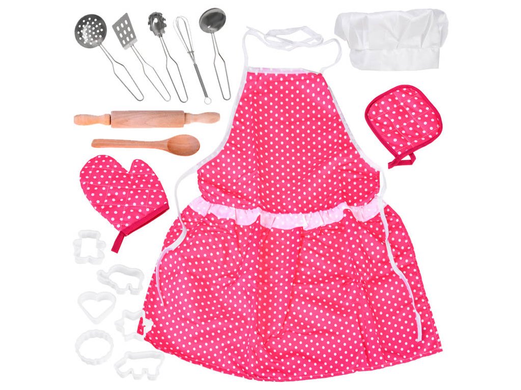 Șorțul roz cu buline și volan în talie nu numai că arată frumos, dar protejează și hainele copilului de murdărire. Datorită pălăriei atașate, el va arăta ca un adevărat bucătar în timp ce gătește. O serie de unelte de bucătărie diferite permit amestecarea, biciuirea și rularea, astfel încât copilul să poată participa activ la pregătirea meselor. Setul de cești de măsurare prezintă copilului concepte precum gramele și mililitrii și permite măsurarea precisă a ingredientelor.