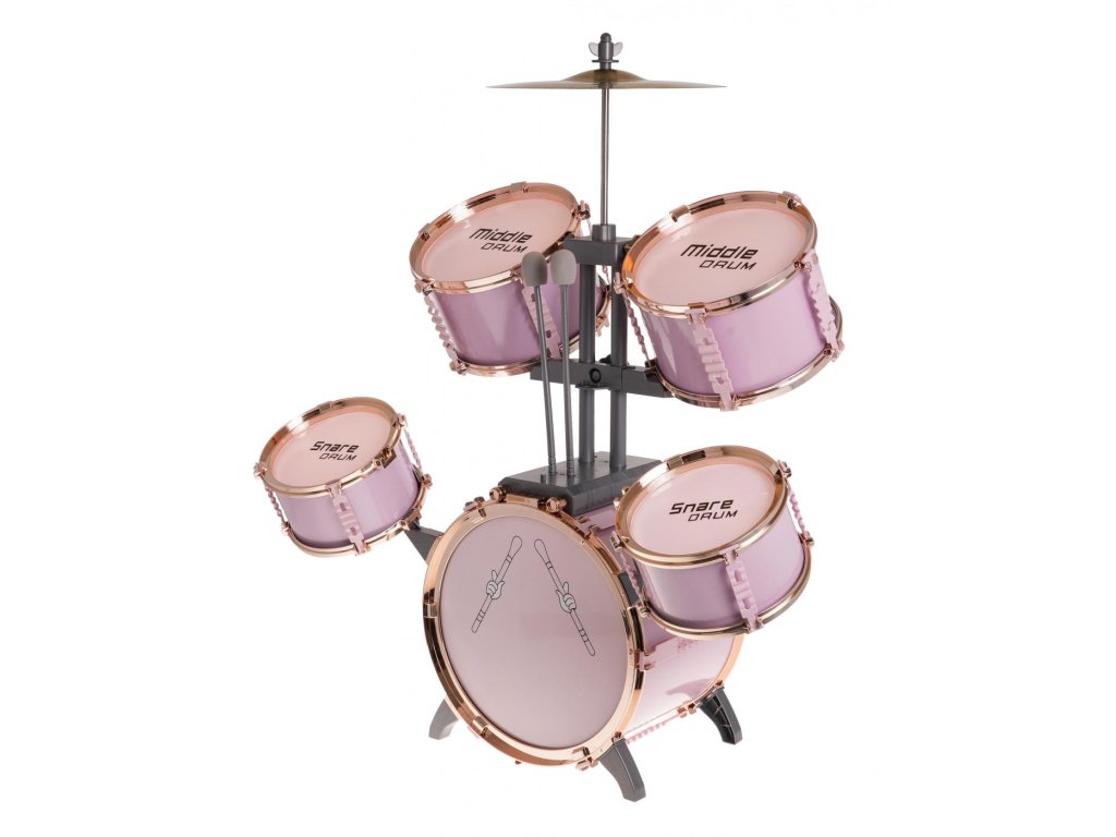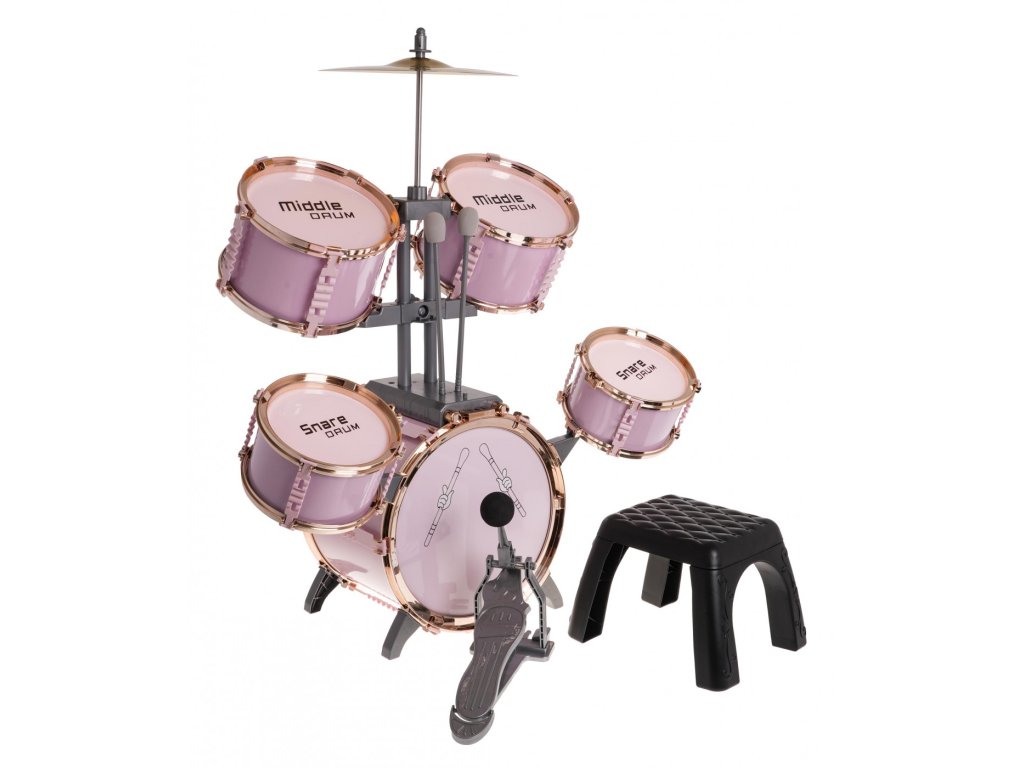 Setul mare de tobe roz cu scaun este un instrument de jucarie pentru copii de la 3 ani . Setul include 5 tobe, un chimval metalic, 2 ciocane si un scaun.