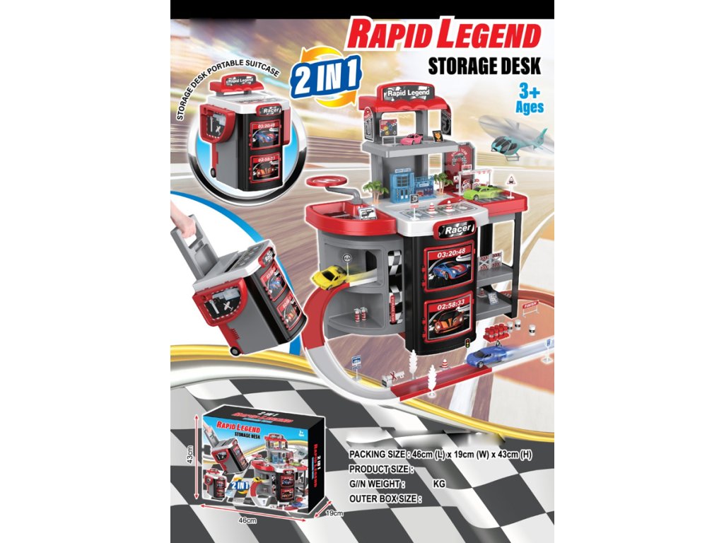 Stația de curse Rapid Legendă oferă un mediu bogat de joc: un garaj pe mai multe etaje, o rampă de ieșire, o stație de service și o pistă de curse. Setul, după ce este împins și fixat, se transformă într-o valiză compactă cu un mâner extensibil. Jucăria este ideală pentru micii fani ai mașinilor și vitezei.