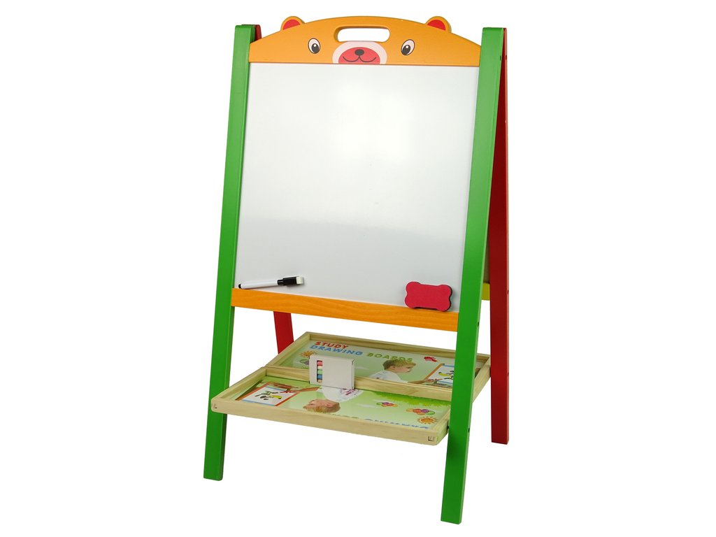 Structura din lemn este complet sigură pentru copii, stabilă și lipsită de elemente periculoase. Tabla este pe un suport pliabil, deci ocupă puțin spațiu atunci când este pliată.
