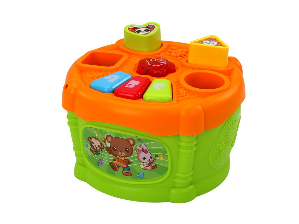 Dar asta nu este tot! Sala noastră de tobe oferă și divertisment interactiv. Introducând blocurile prin orificiile corecte și apăsând butonul cu mânerul din centrul jucăriei, copilul se poate bucura de sunetul din palme, care îl motivează și mai mult să exploreze și să interacționeze.