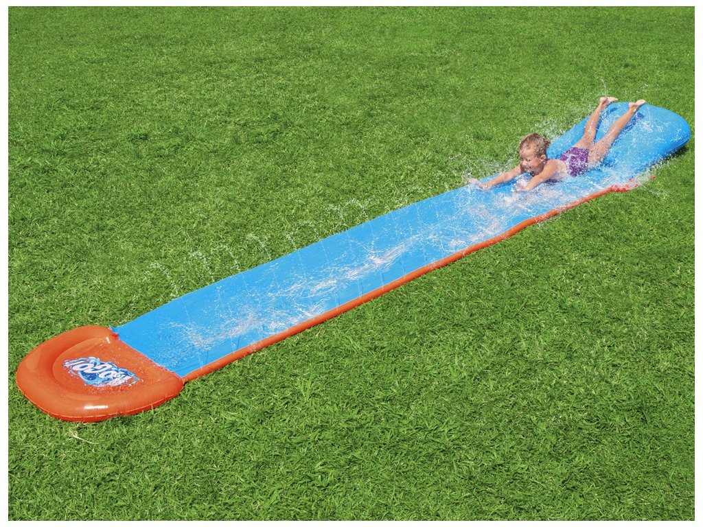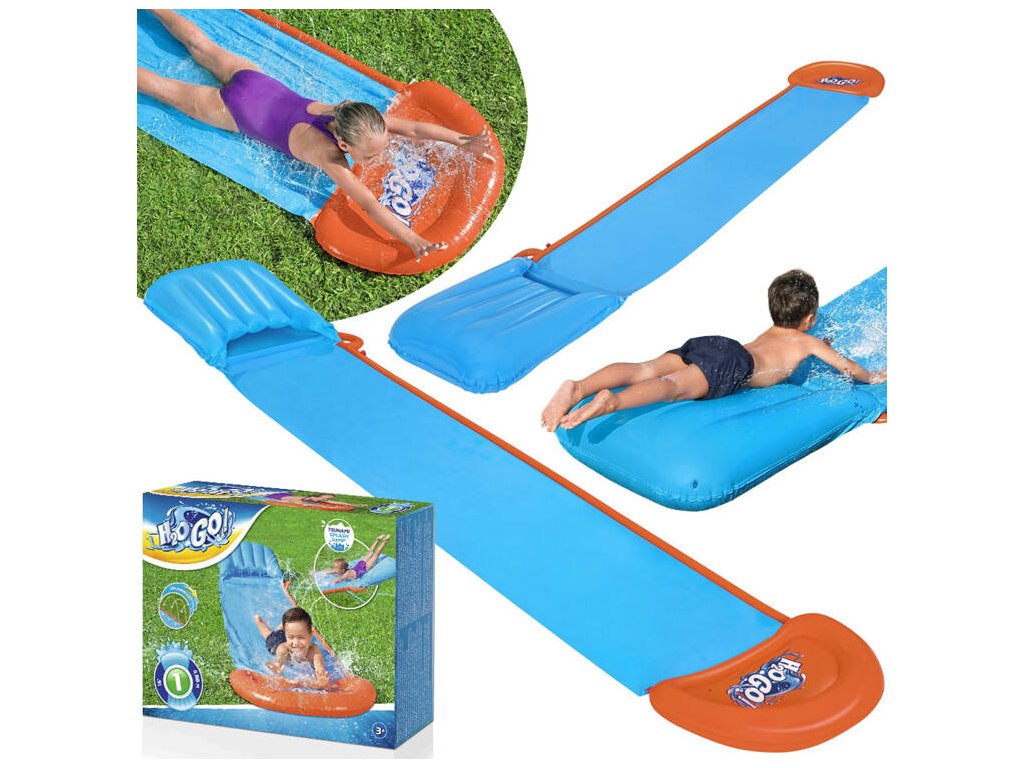 Tobogan cu apă H2O GO! Bestway este pentru cei care iubesc distracția în aer curat. Pista este irigată cu ajutorul dușurilor, care se află pe tobogan și funcționează după conectarea unui furtun de grădină la conectori speciali. Dușurile cu apă integrate în tobogan asigură o alunecare maximă, apa curgătoare menține toboganul curat, iar jeturile de apă oferă răcoare în zilele toride. Datorită designului atent, apa de scurgere se adună la capătul covorașului gonflabil, asigurând o frânare moale cu o stropire mare! Construcția modernă și materialul durabil și testat utilizat pentru fabricarea toboganului garantează o întreținere ușoară și fără probleme. Doar desfaceți toboganul și organizați o cursă distractivă, oricine este primul care câștigă! Distracție imbatabilă garantată!