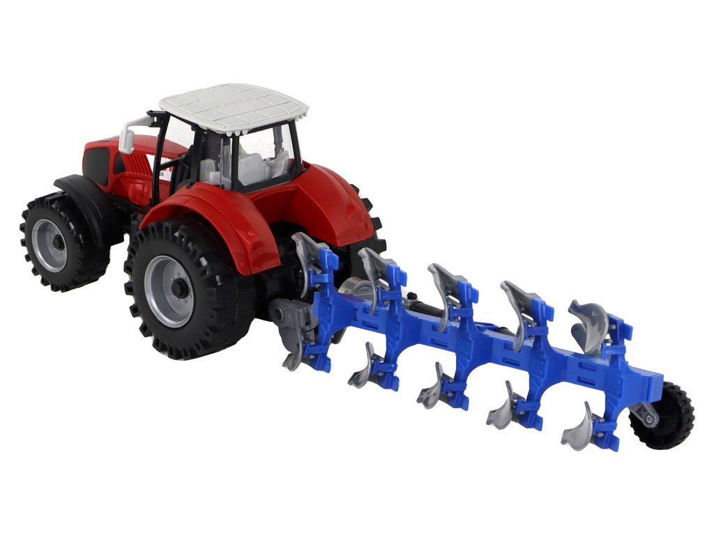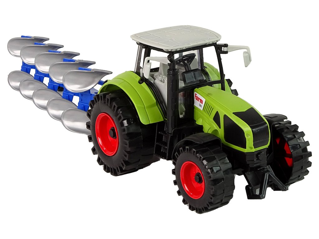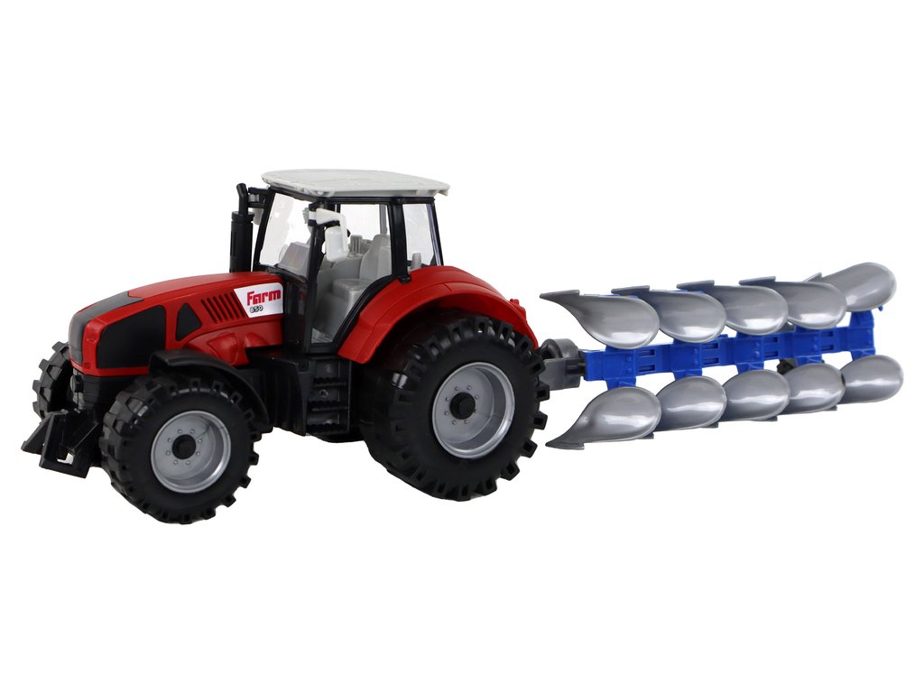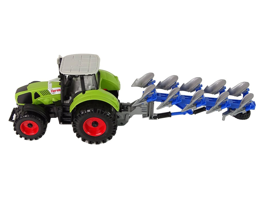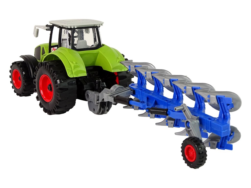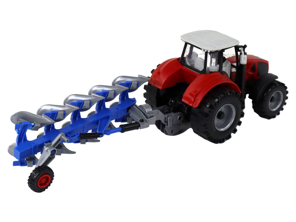 Setul include și un plug albastru-gri care poate fi rotit și ridicat în timp ce conduceți tractorul. Când doriți să utilizați plugul, ridicați doar roata și plugul se va coborî, permițând cultivarea eficientă a câmpului în timp ce vă jucați. Plugul are și părți mobile, ceea ce îmbogățește experiența și stimulează imaginația micilor fermieri.