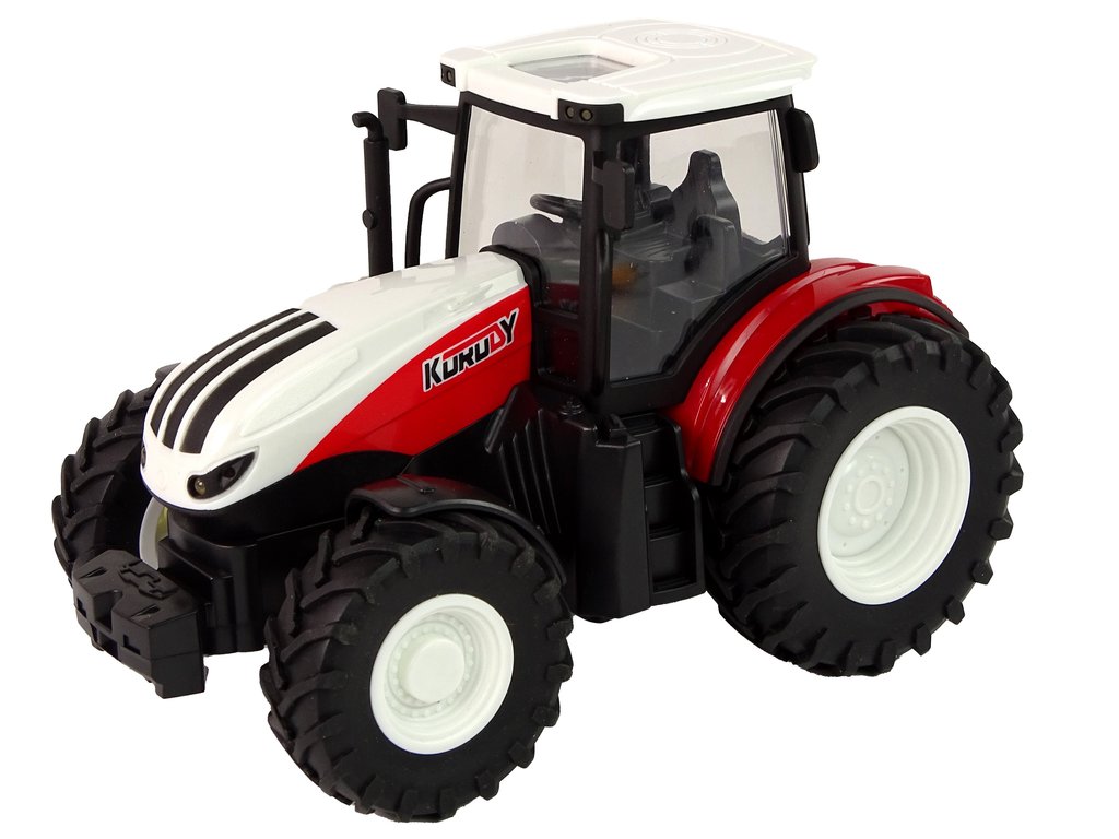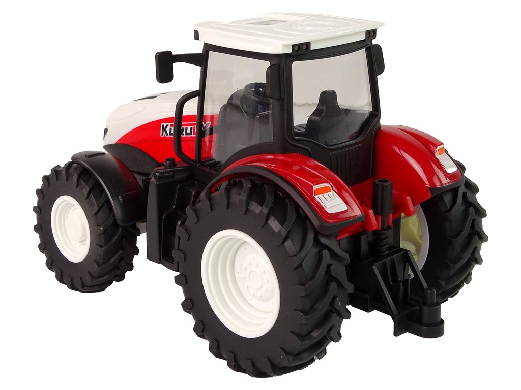 Întregul corp este realizat din metal, ceea ce garantează durabilitatea. Culoarea roșie cu acoperișul alb este o combinație ideală care atrage atenția. Farurile funcționează în timpul mersului și luminează drumul. Controlul cu ajutorul telecomenzii este foarte simplu. În plus, este posibil să-l controlezi înainte, înapoi și lateral. Frecvența de funcționare a acestuia este de 2,4 GHz. Datorită formei sale, controlerul se potrivește confortabil în mână, iar utilizarea sa este intuitivă. Tractor interactiv cu telecomanda, realizat la scara 1:24.